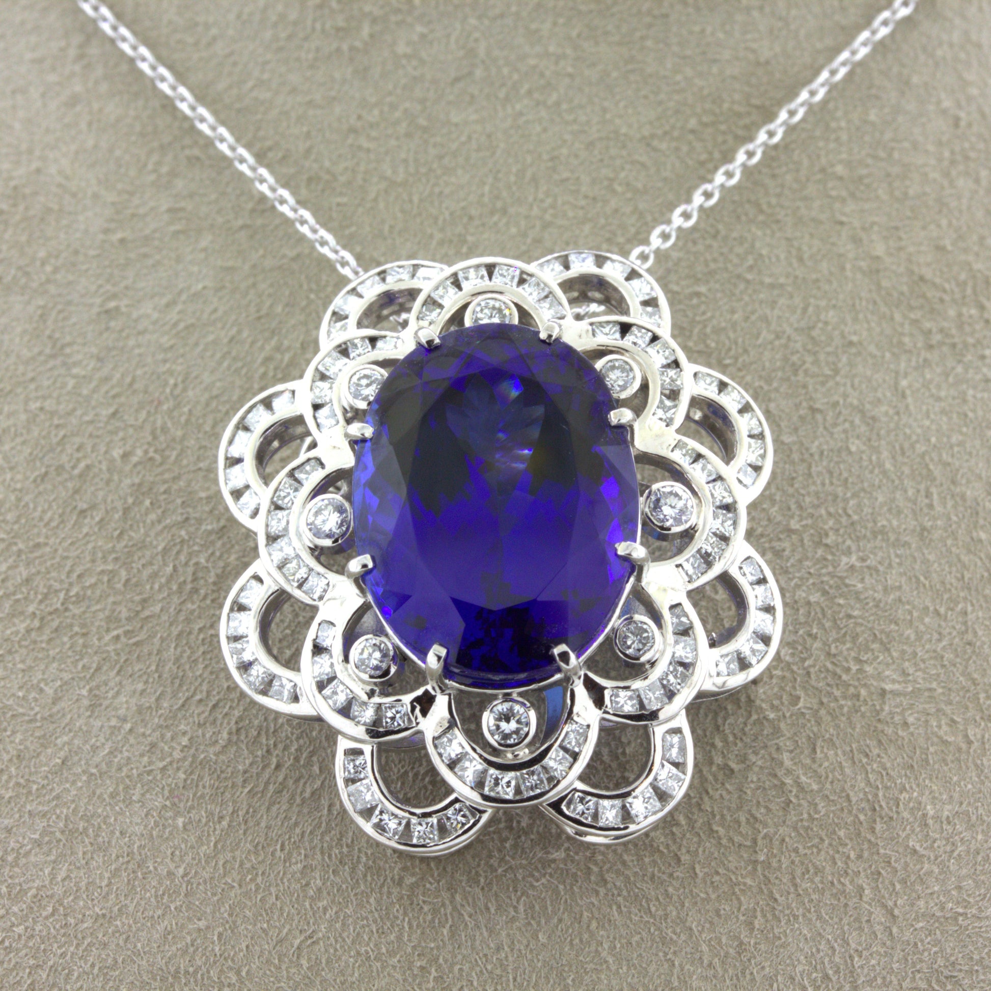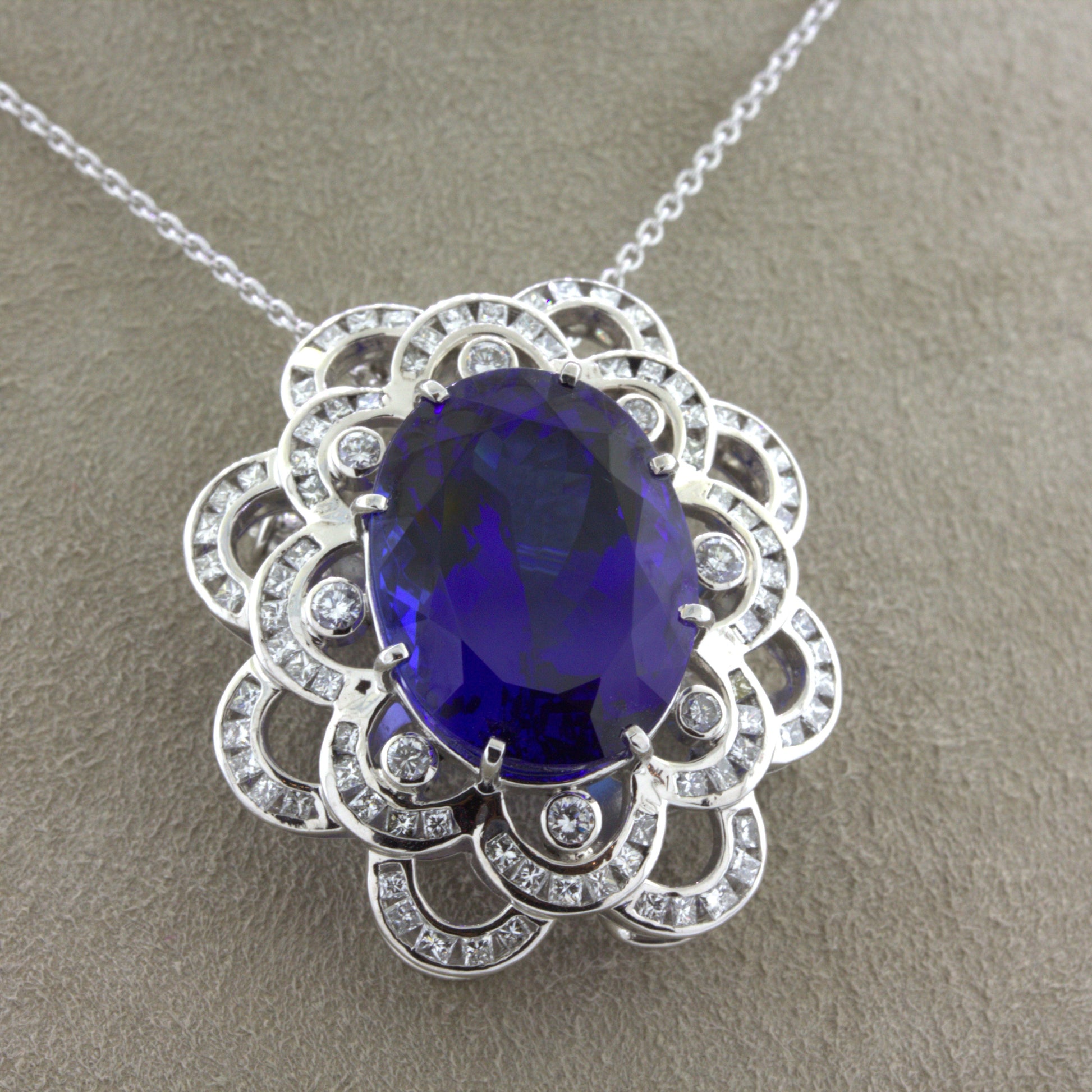A large 15.12 carat gemmy tanzanite takes center stage of this platinum made pendant which can also be worn as a brooch. It has a rich jelly purplish-blue color that often gets misidentified as sapphire due to its rich dominantly blue color. The oval-shaped gem is surrounded by 1.13 carats of diamonds set in a spiraling floral pattern adding brilliance and sparkle to the piece. Hand-fabricated in platinum and ready to be worn as a pendant or remove the chain to wear as a brooch.