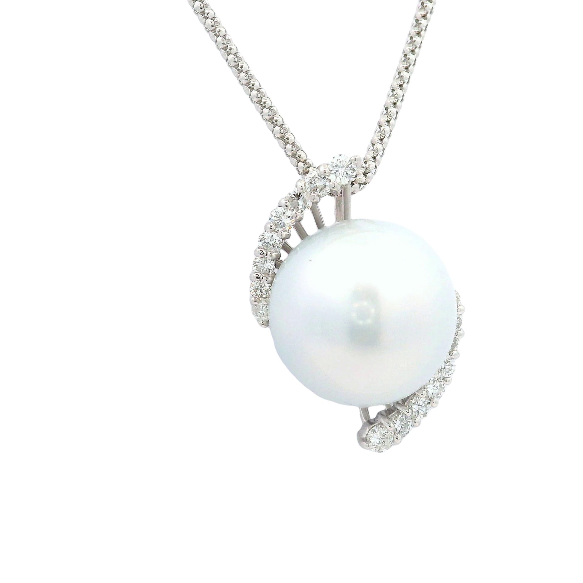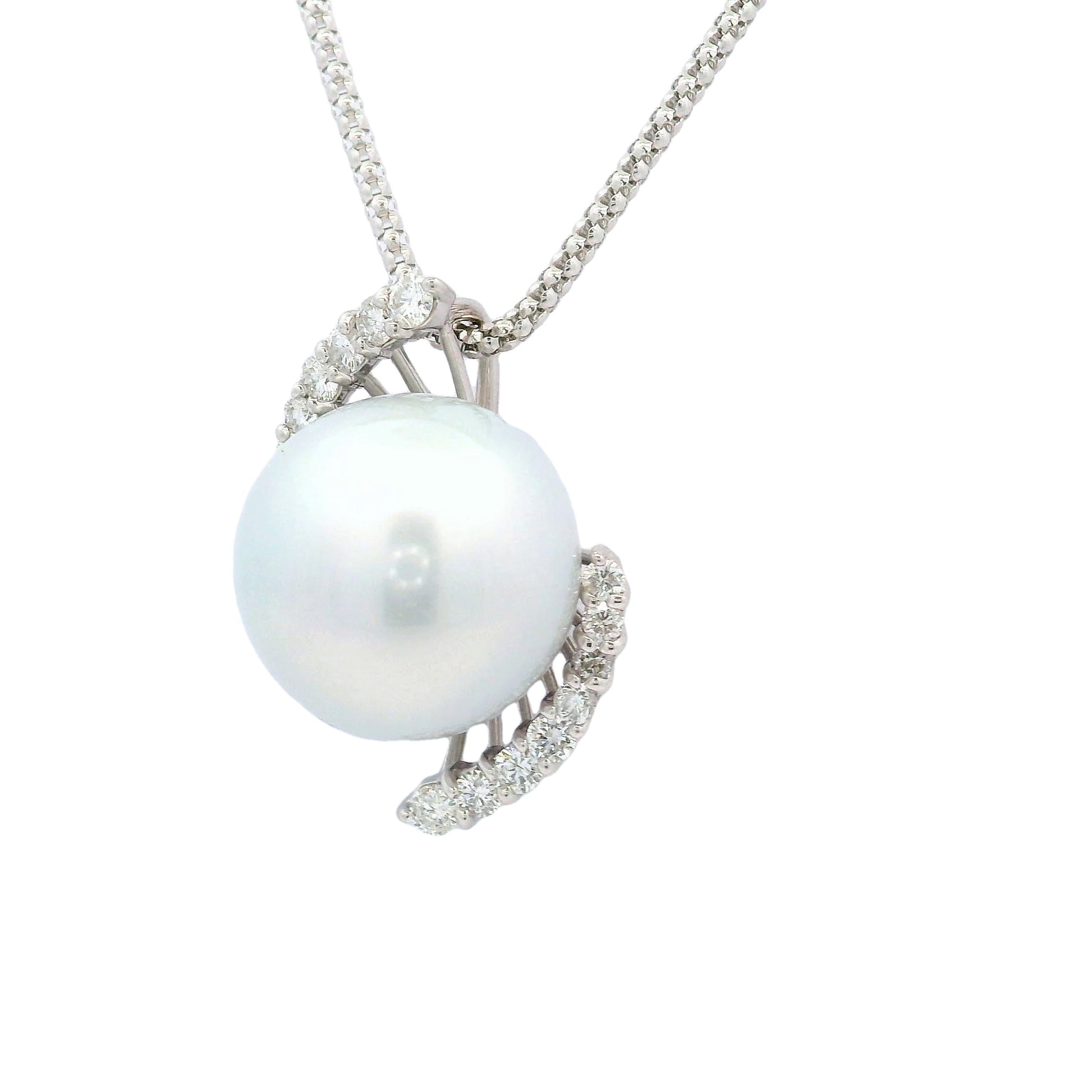 A refined pendant necklace featuring a 15.5mm South Sea pearl. The pearl exhibits a lustrous white color with a smooth and vibrant nacre quality making the pearl glow in the light. It is elegantly accented by 0.60 carats of round-cut diamonds, adding a touch of sparkle with their brilliant white hue. The pendant is crafted in 18k white gold, enhancing its contemporary appeal. This piece is both stylish and versatile.