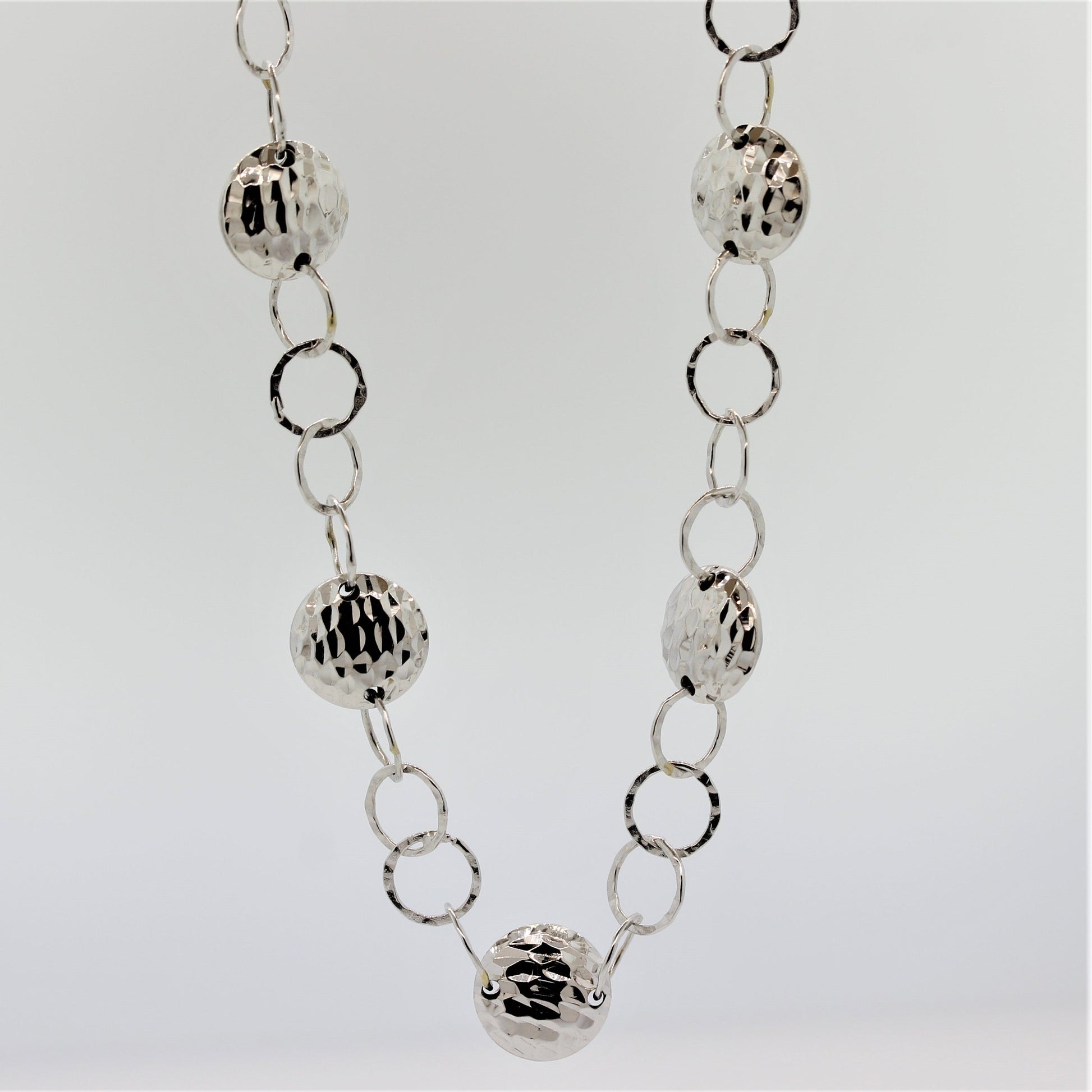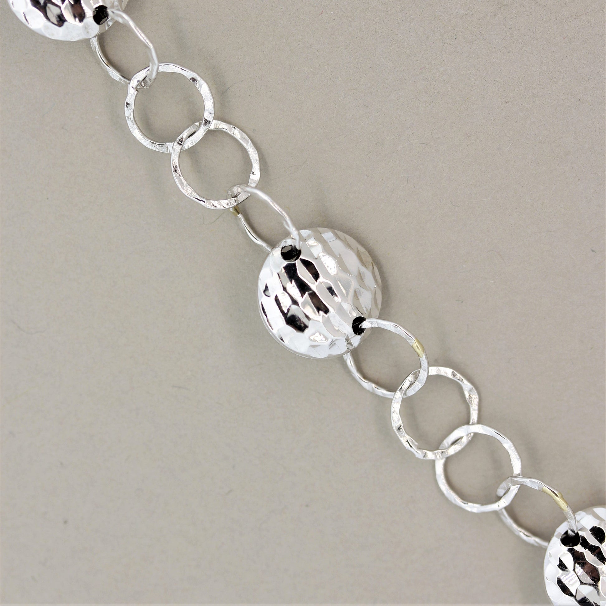 A simple yet elegant chain necklace. It is made in 18k white gold and hand worked and hammered to form rounded gold accents. They have a textured finish and a high polish giving the piece a bright shining look. Lightweight and easy to wear.