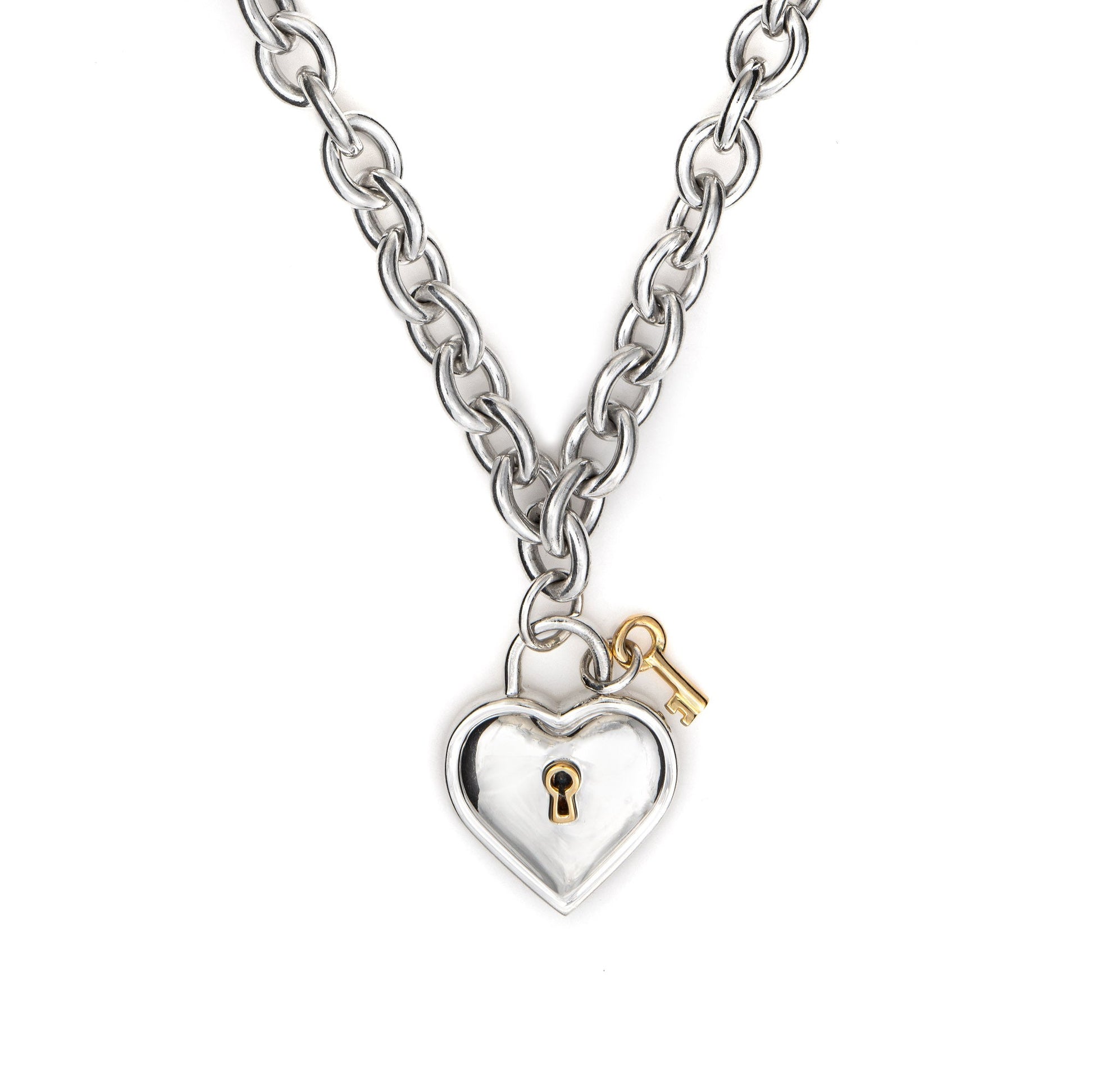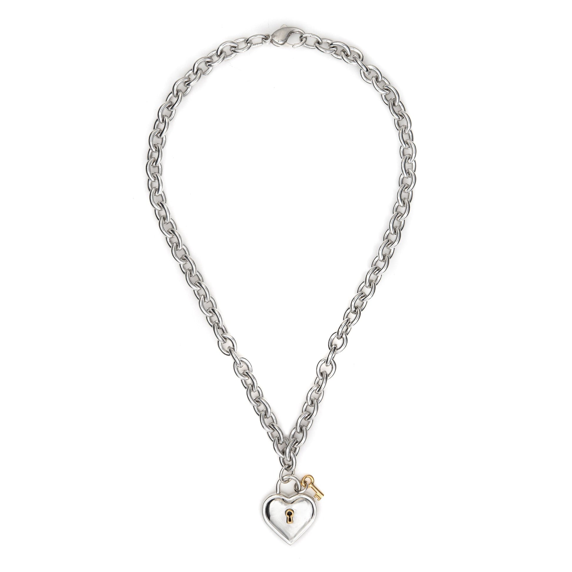 Overview: Stylish and finely detailed vintage Tiffany & Co heart key lock necklace, crafted in sterling silver & 18 karat yellow gold (circa 1994). Specifications: