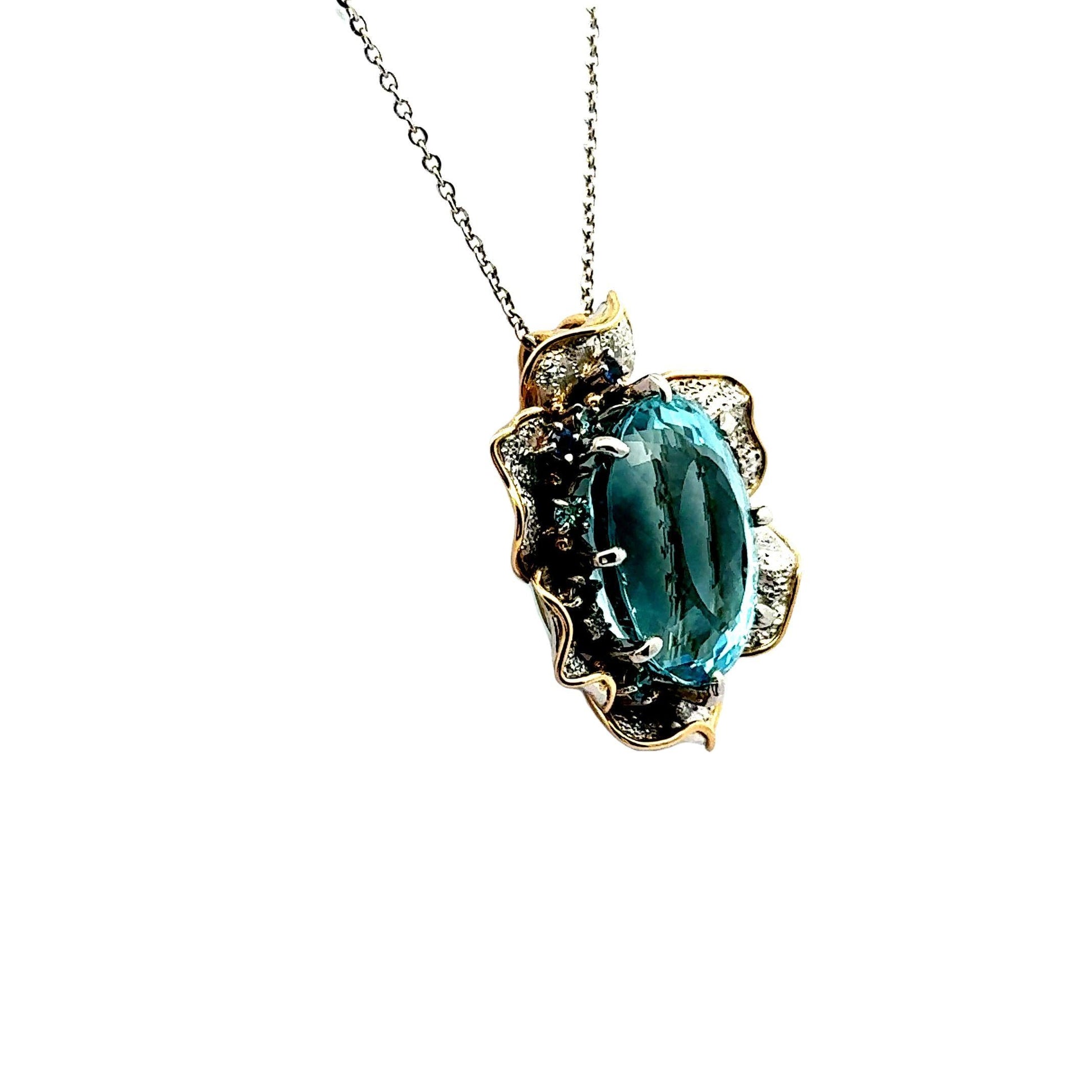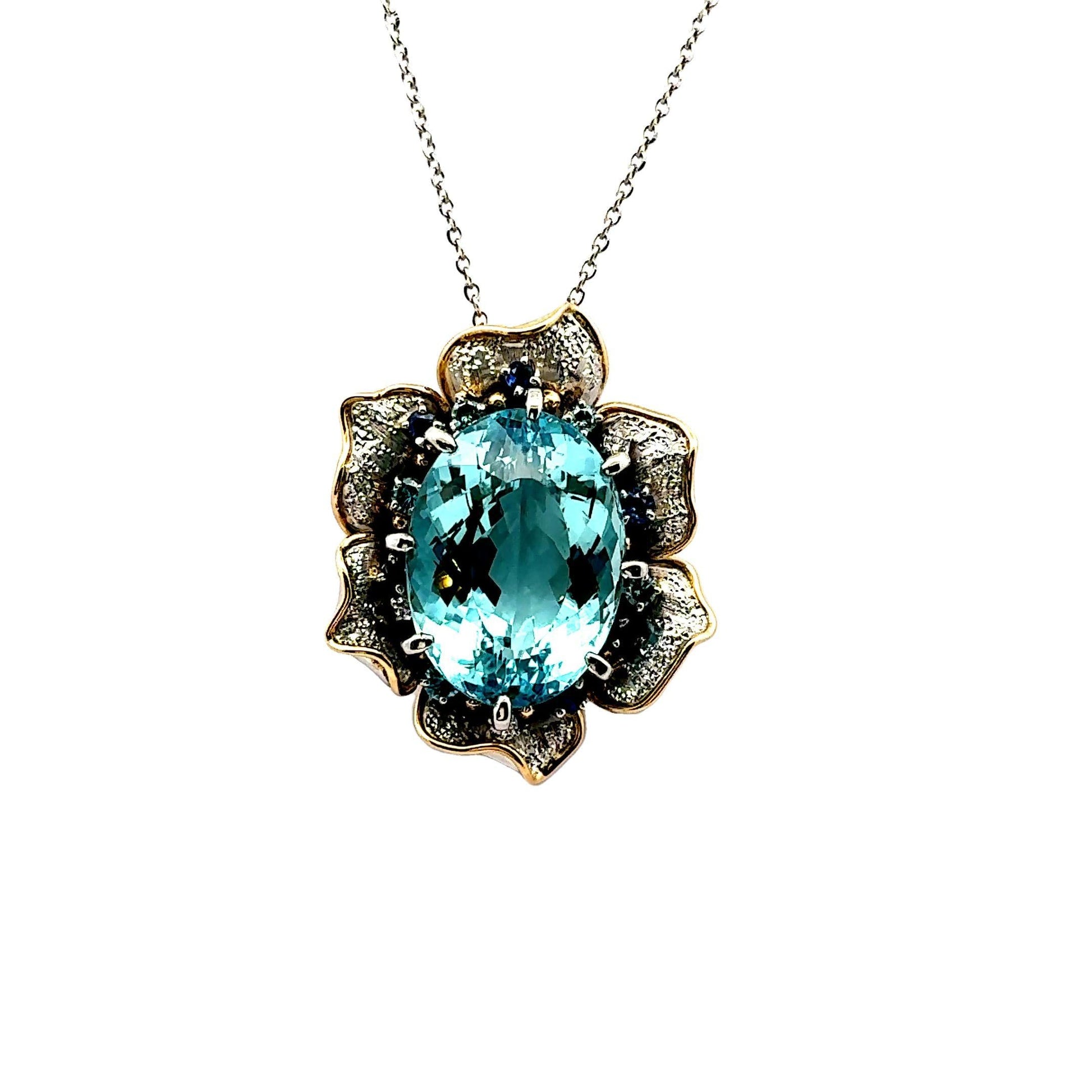 A striking pendant necklace featuring a magnificent 24.34-carat oval aquamarine. The aquamarine displays a captivating and vibrant sea-blue hue, set within a floral design. It is accented by 0.42 carats of round blue sapphires, adding depth and contrast. Additionally, 0.41 carats of diamonds embellish the piece, enhancing its brilliance and sparkle. Crafted in a combination of 18k yellow gold and platinum, this necklace embodies contemporary elegance. A sophisticated addition to any jewelry collection.