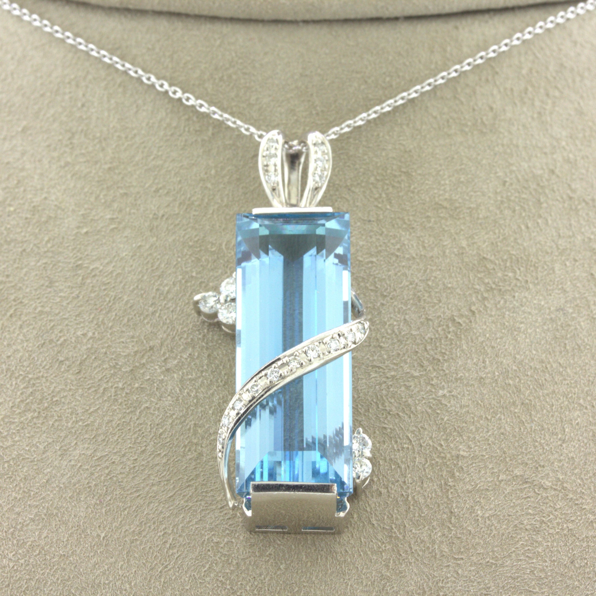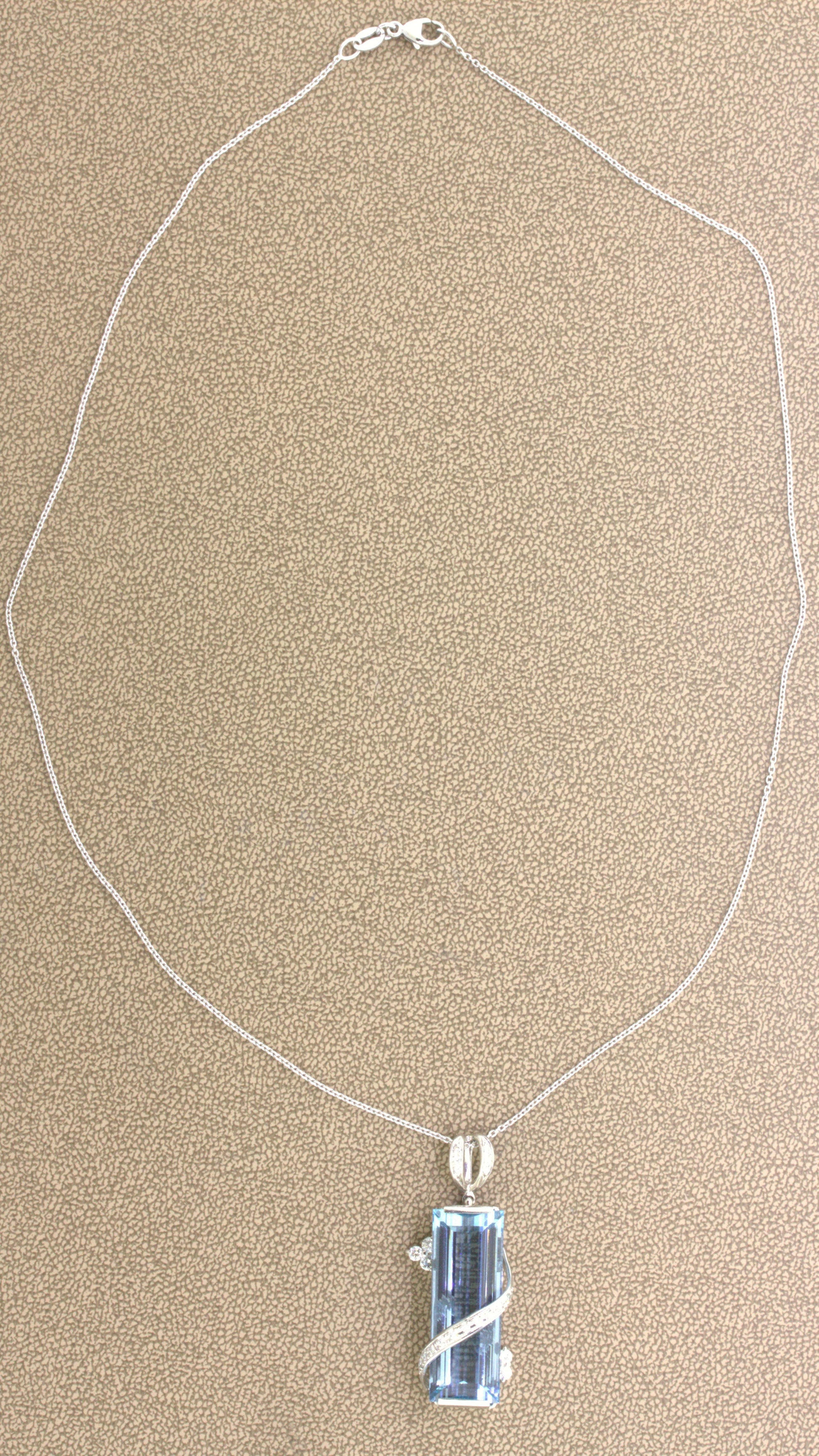 A chic and stylish pendant featuring a large rectangular aquamarine weighing 25.10 carats. It has a rich bright sea-blue color which aquamarine is famous for. It is complemented by 0.40 carats of round brilliant-cut diamonds which are set atop the pendant, on its sides, and even wrapped around the gemstone in a platinum swirl. Hand-fabricated in platinum, this lovely pendant is ready to be worn.