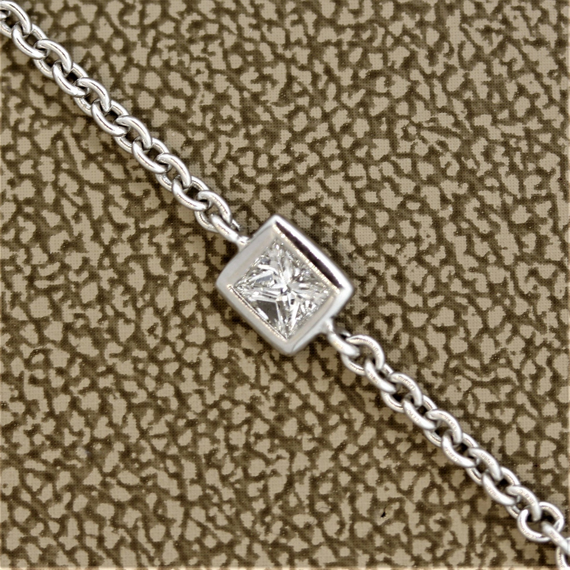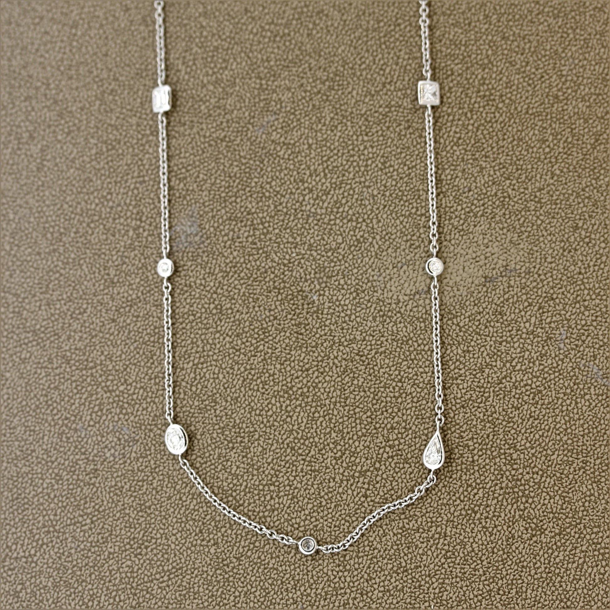 A unique styled ¡°Diamonds by the Yard¡± necklace featuring large fancy cut diamonds! The 35-inch necklace features 21 individual diamonds, 11 of them being round brilliant cuts which are set between each larger fancy cut diamonds. The fancy shaped diamonds include emerald cuts, ovals, princess, pear, triangular, and asscher cut diamonds. Each weighing over ? of carat. In total the diamonds weigh 4.78 carats and are set in 18k white gold. A special Diamonds by the Yard.