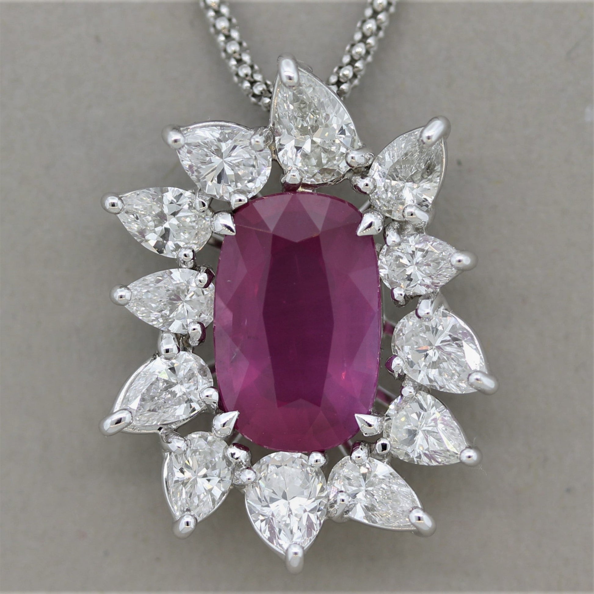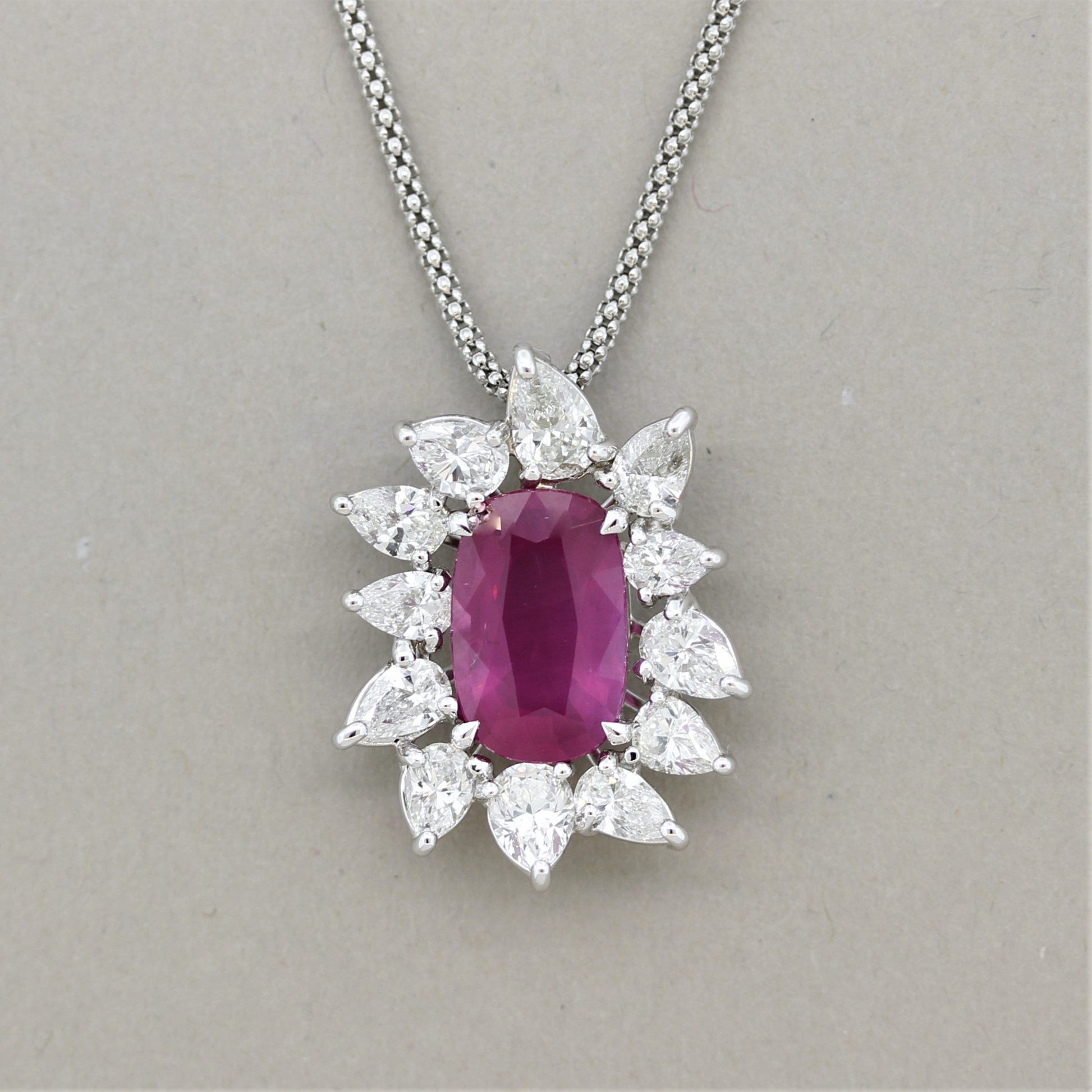 A fine gem quality unheated ruby takes center stage! Graded by the GIA as natural with no treatments, this 4.14 ruby is exceptional. Rubies over 3 carats are scarce, especially unheated and untreated stones. This ruby has a rich velvety pinkish-red color. It is accented by a halo of large pear-shape diamonds weighing 2.41 carats, which add sparkle and brilliance to the piece. Made in 18k white gold and ready to be worn! Comes with an 18 inch adjustable chain.