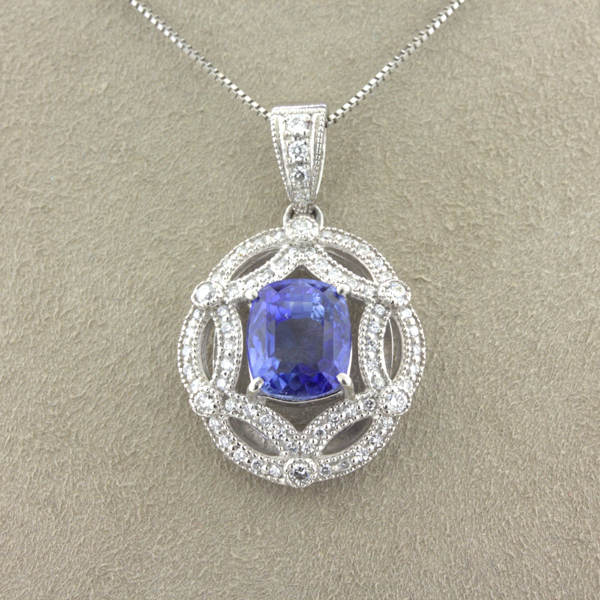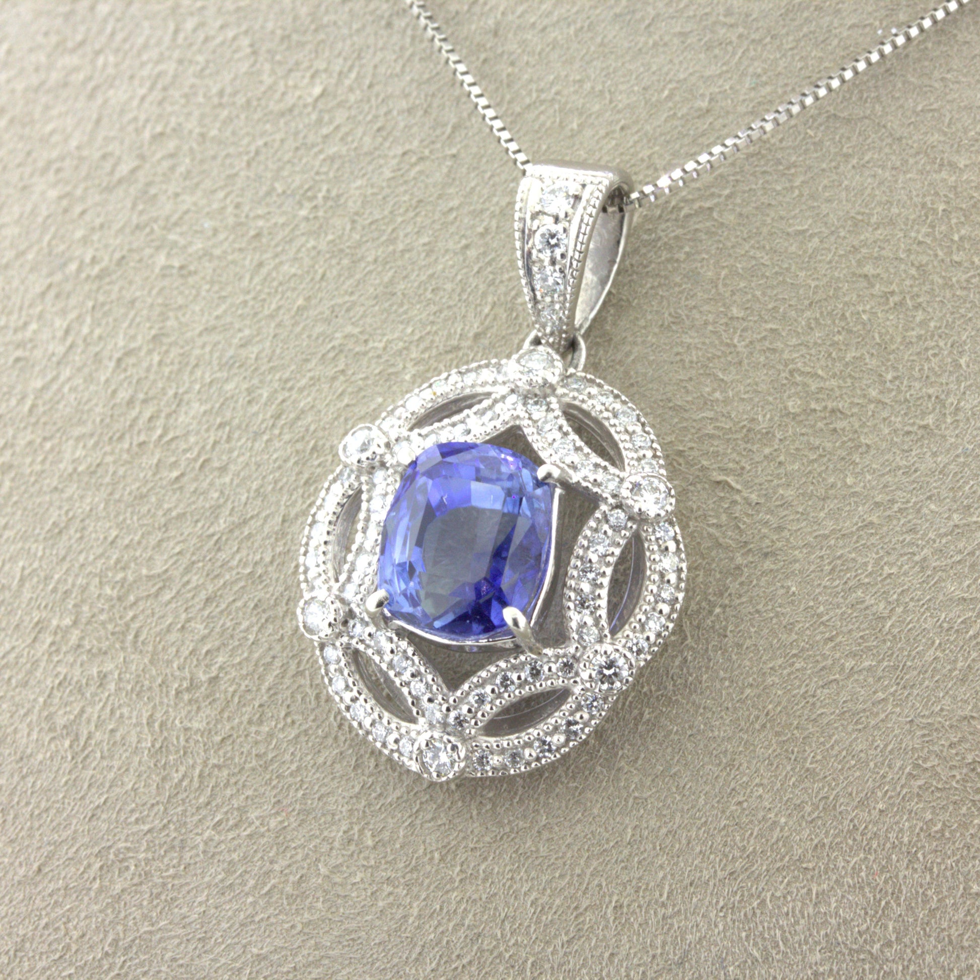 A lovely platinum pendant featuring a 4.80 carat cushion-cut blue sapphire. It has a lovely shape with excellent proportions and a soft open blue color with plenty of brightness and life. It is complemented by 0.56 carats of round brilliant-cut diamonds set around the sapphire in a stylish star pattern. Hand-fabricated in platinum and ready to be worn!