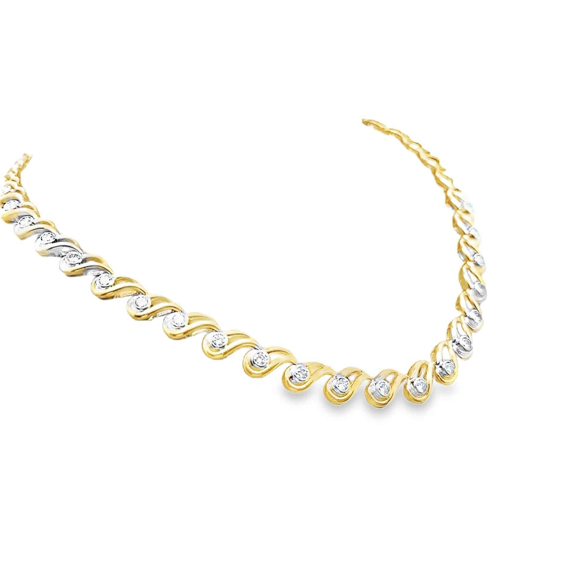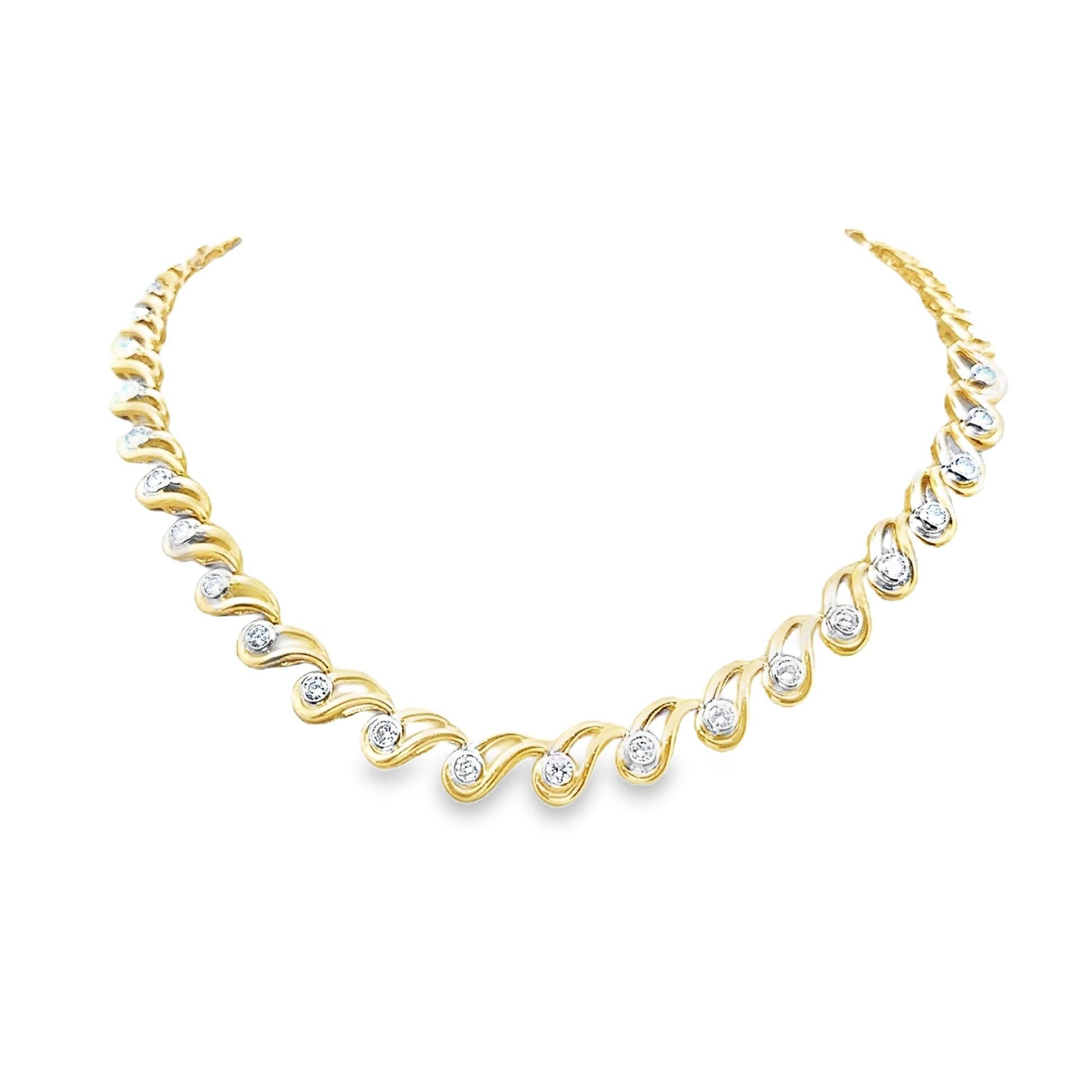 An elegant and modern necklace featuring 6.82 carats of round brilliant-cut diamonds. Each diamond is bezel-set in yellow gold frames that link with one another. A modern take on the classic tennis necklace, made in 18k yellow gold and ready to be worn.
