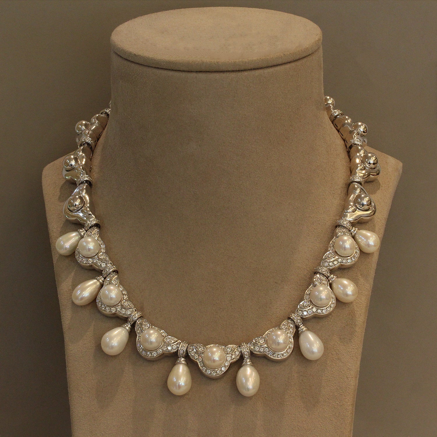 A fanciful necklace with drops of perfectly lustrous drop shaped Akoya pearls separated by round Akoya pearls that are surrounded by 2.40 carats of round cut diamonds in an 18K white gold setting. The drops of Akoya pearls have just the right amount of movement to create an even flow. The box clasp closure ensures a secure lock.