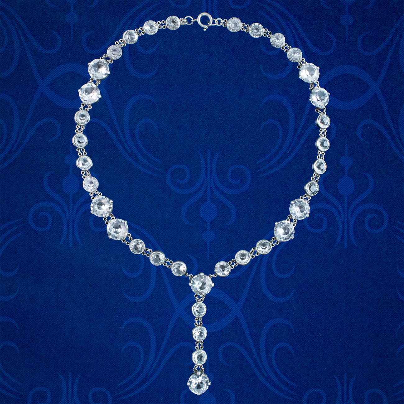 A wonderful Art Deco necklace from the 1920s decorated with glistening, clear pastes that simulate the beauty of large diamonds. The stones vary in size and lead to a long dropper hanging from the bottom.