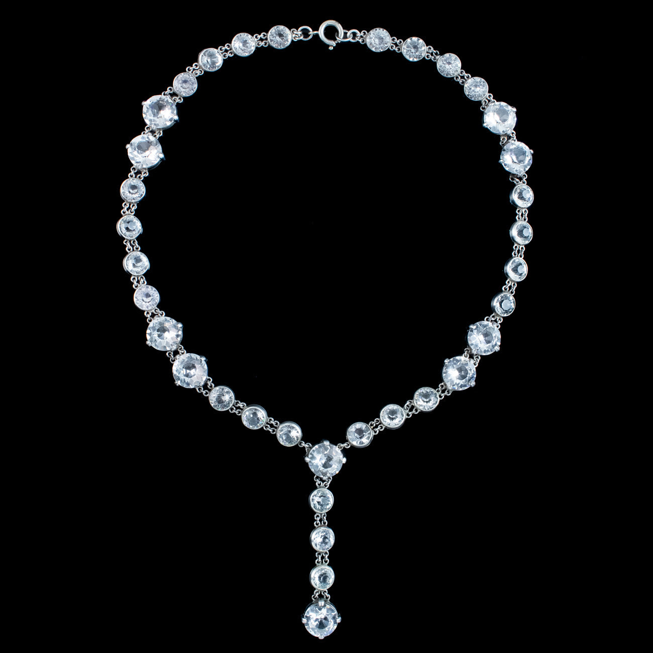 Each stone is held securely in a silver frame with milgrain edging and leads to a large ring clasp at the end. It¡¯s in excellent condition and perfect for a wedding or glamorous occasion.