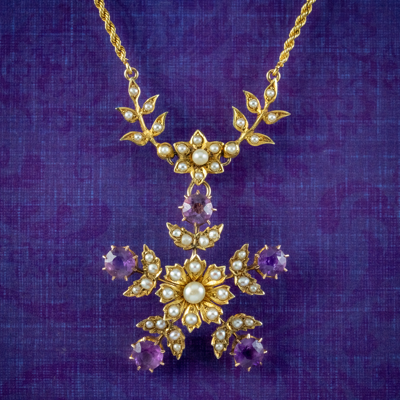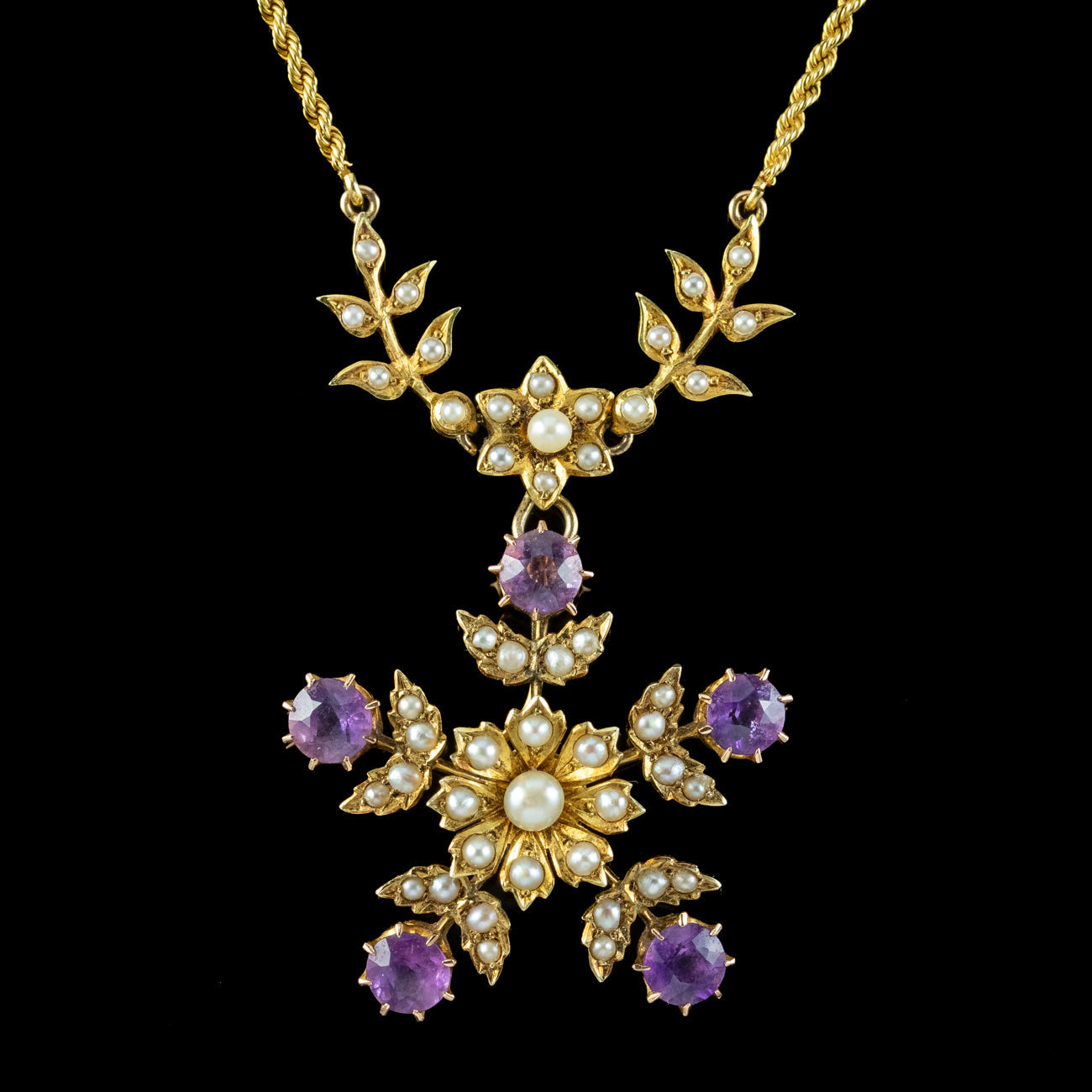 A beautiful antique Edwardian lavaliere necklace adorned with a stunning floral pendant decorated with pearl studded flowers and leaves with five purple amethysts growing out of the largest flower at the bottom.?