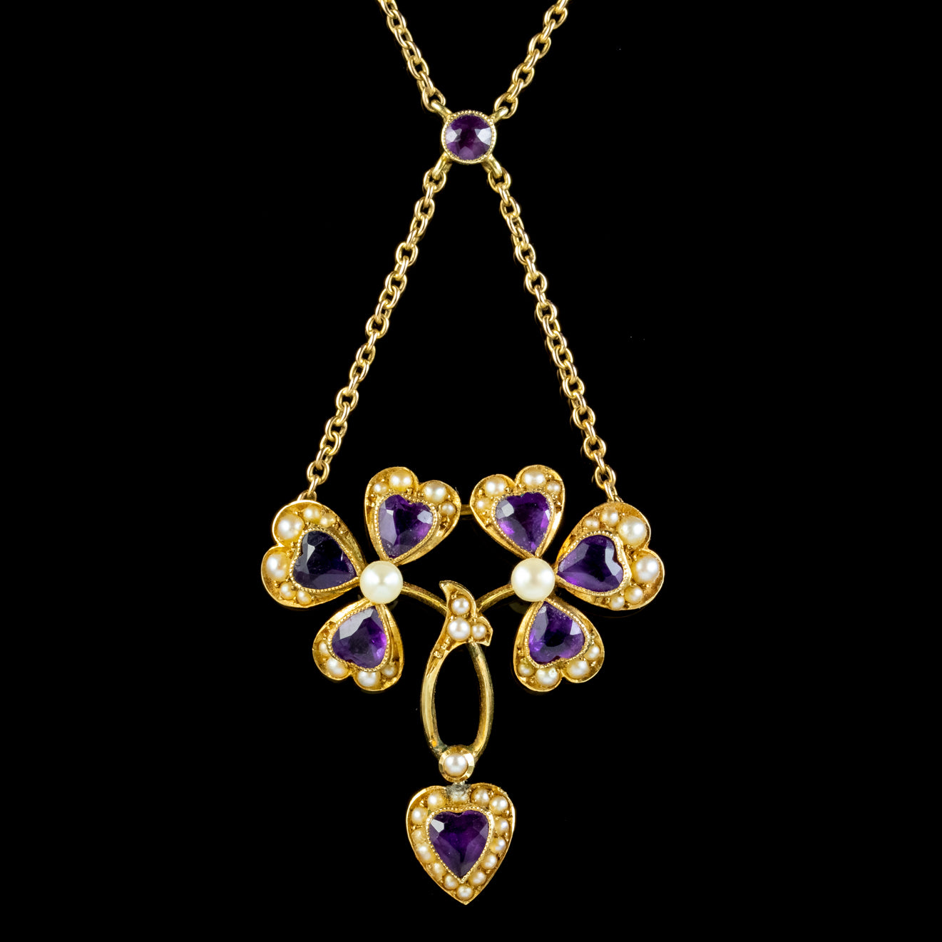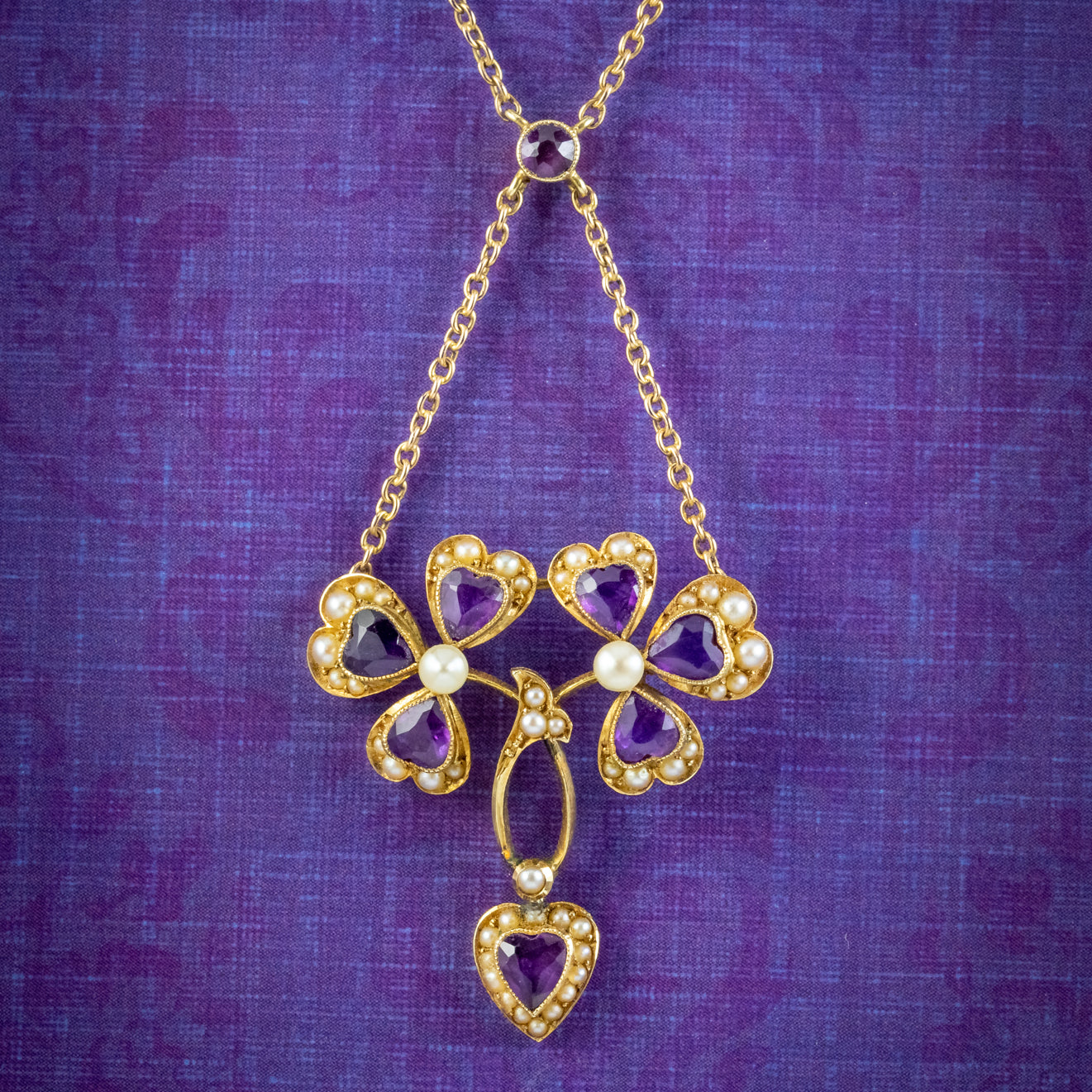 A beautiful Antique Edwardian lavaliere necklace from the turn of the 20th Century featuring a pretty Art Nouveau pendant depicting two shamrocks decorated with heart shaped Amethysts and Pearls with a heart dropper hanging from the bottom.??