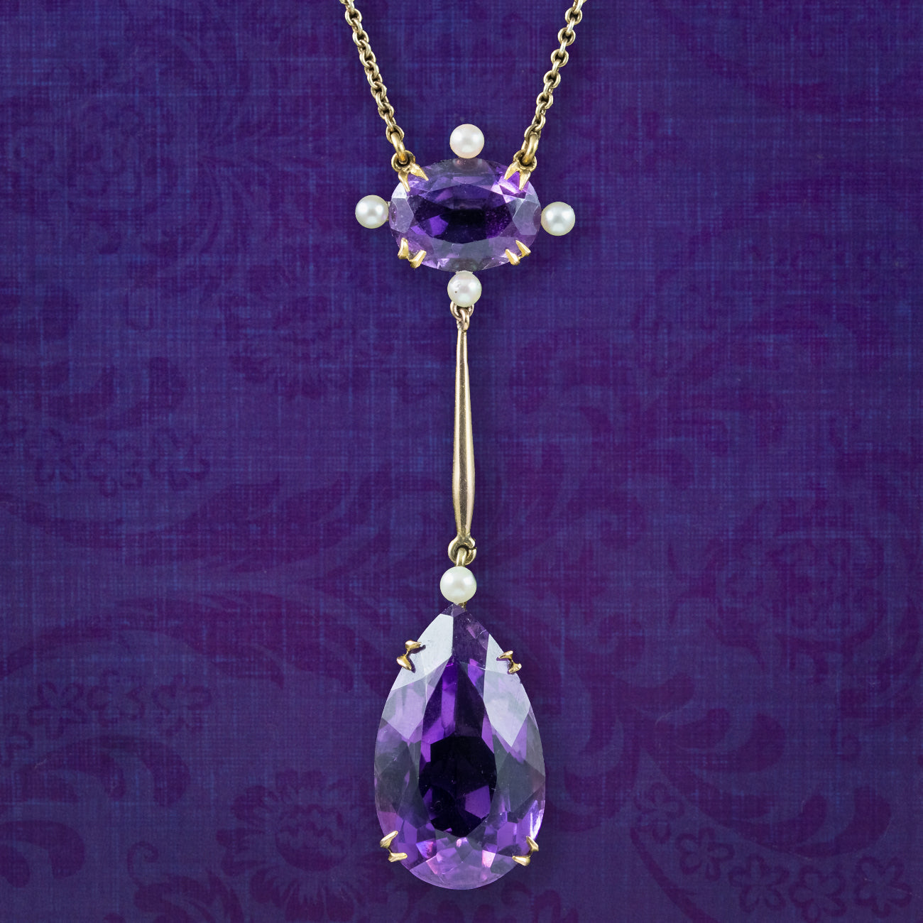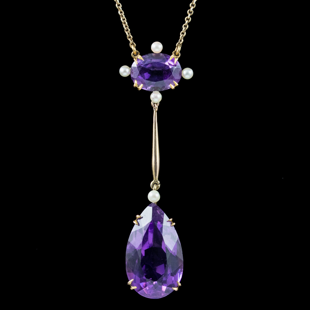 An elegant antique Edwardian lavaliere necklace adorned with a fabulous pendulum dropper consisting of a large oval and pear cut amethyst, surrounded by five white cultured pearls, with a gold bar connecting the two. Both amethysts have a desirable deep violet hue and weigh approx. 2.7ct and 9ct at the bottom.?