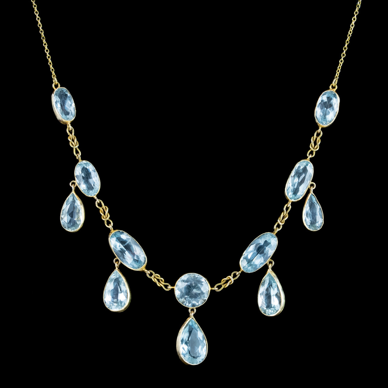 A glamorous antique Edwardian aquamarine dropper necklace, adorned with twelve clear-blue aquamarines, weighing between 2 ¨C 4.5ct (approx. 36ct total). The stones are a combination of round and oval cuts, with five pear cut droppers dangling from the bottom. They¡¯re set in 15ct gold milgrain bezel frames, with pretty love knot links connected in-between.