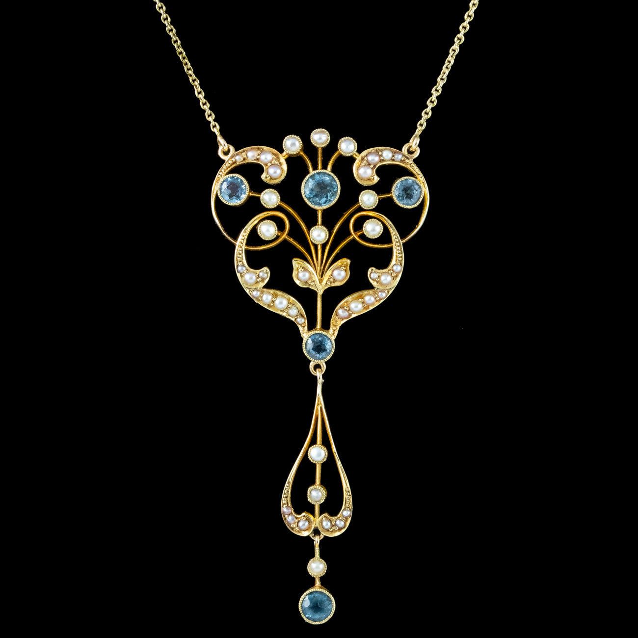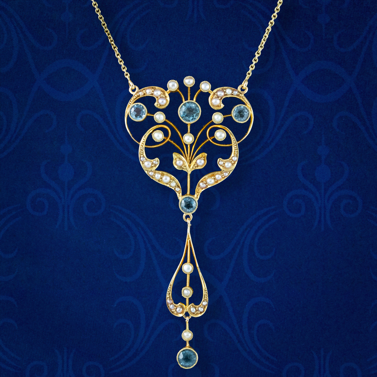 A beautiful antique Art Nouveau lavaliere necklace adorned with a fabulous dropper pendant decorated with five ocean blue aquamarines (approx. 0.90ct total) and an array of creamy, white seed pearls.