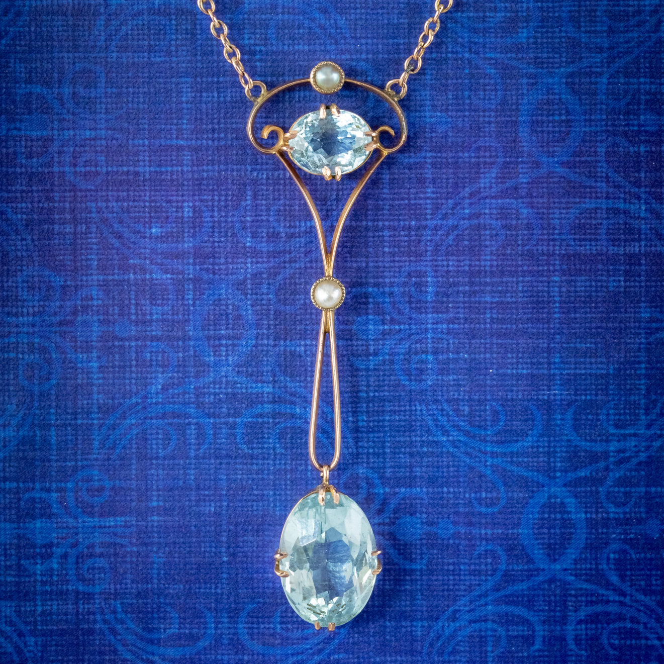 Antique Edwardian Aquamarine Pearl Lavaliere Necklace 9ct Gold 4.30ct Of Aqua Circa 1905