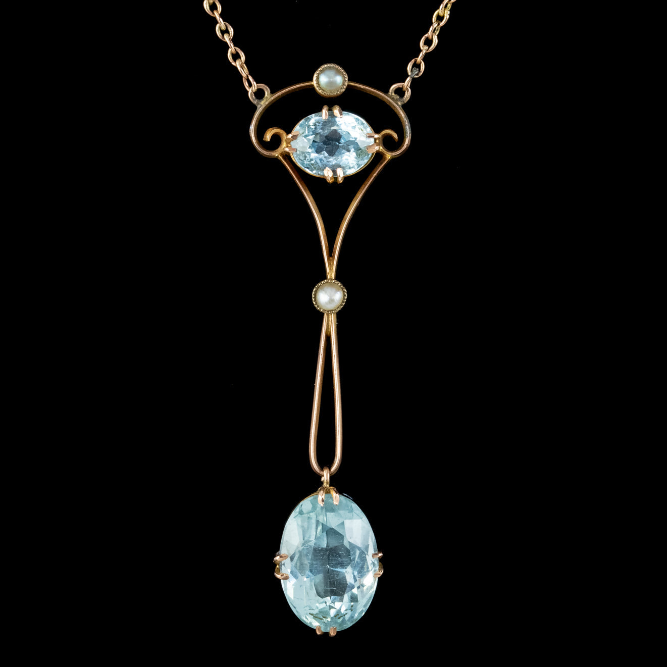 An elegant Antique Edwardian lavaliere necklace featuring a lovely flowing 9ct Gold pendant adorned with two large, clear blue Aquamarines which weigh approx. 0.80ct and 3.5ct and two small Pearls sat above each. ??