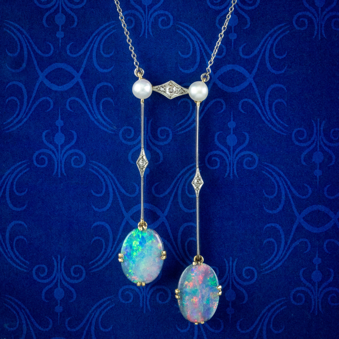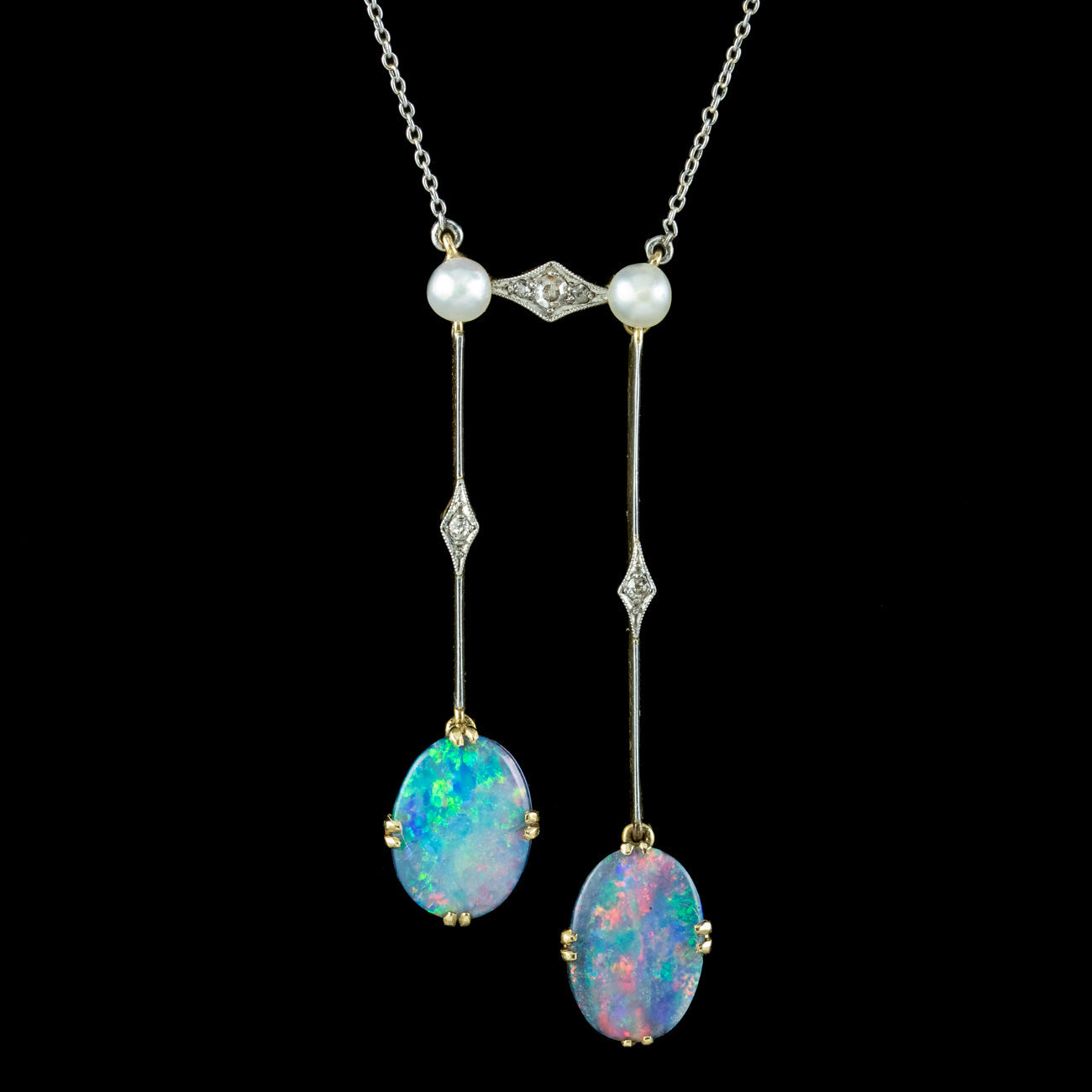 An elegant antique Edwardian negligee necklace from the early 20th Century featuring two long droppers adorned with enchanting black opal doublets. They radiate a mesmerising array of vibrant colours and are complemented by twinkling diamonds and two cultured pearls above.?