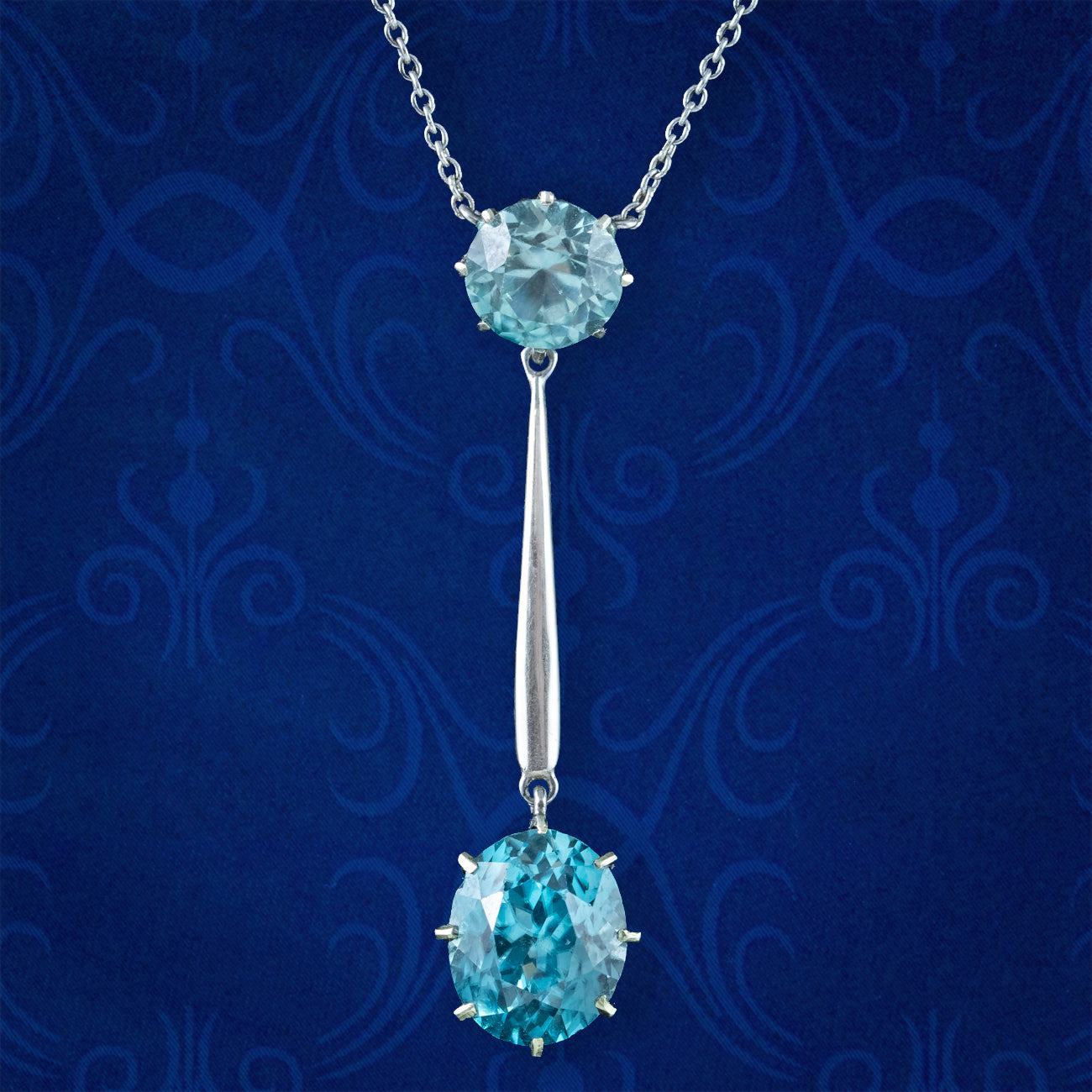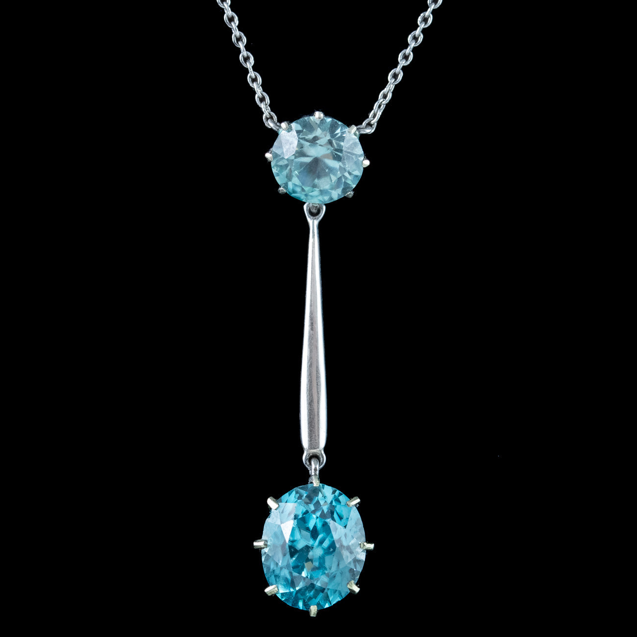An elegant antique lavaliere necklace from the early 20th Century featuring a beautiful pendulum pendant consisting of two radiant blue zircons weighing approx. 3ct at the bottom and 1.4ct at the top. They¡¯re both held in 9ct white gold crown settings with a slender bar in between.