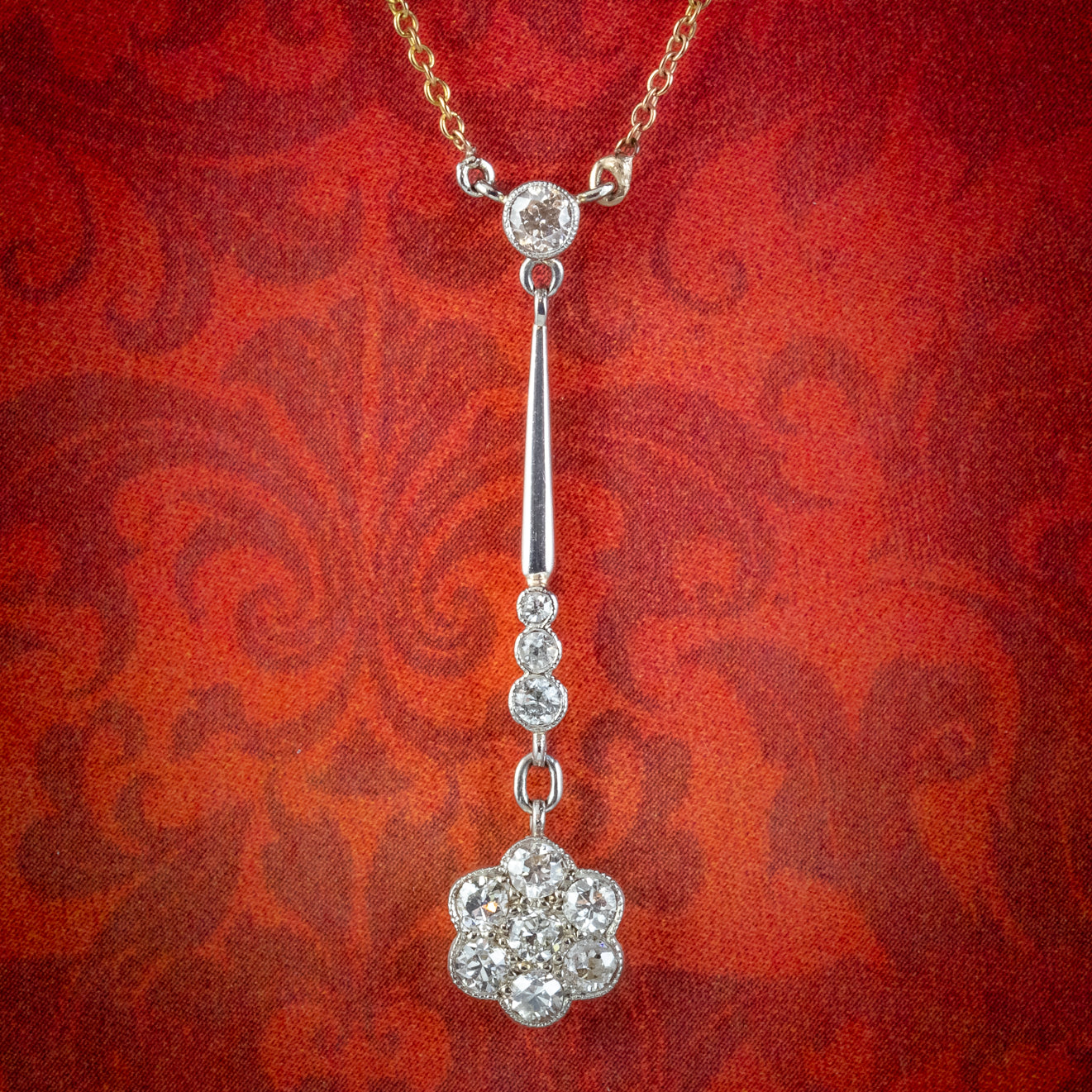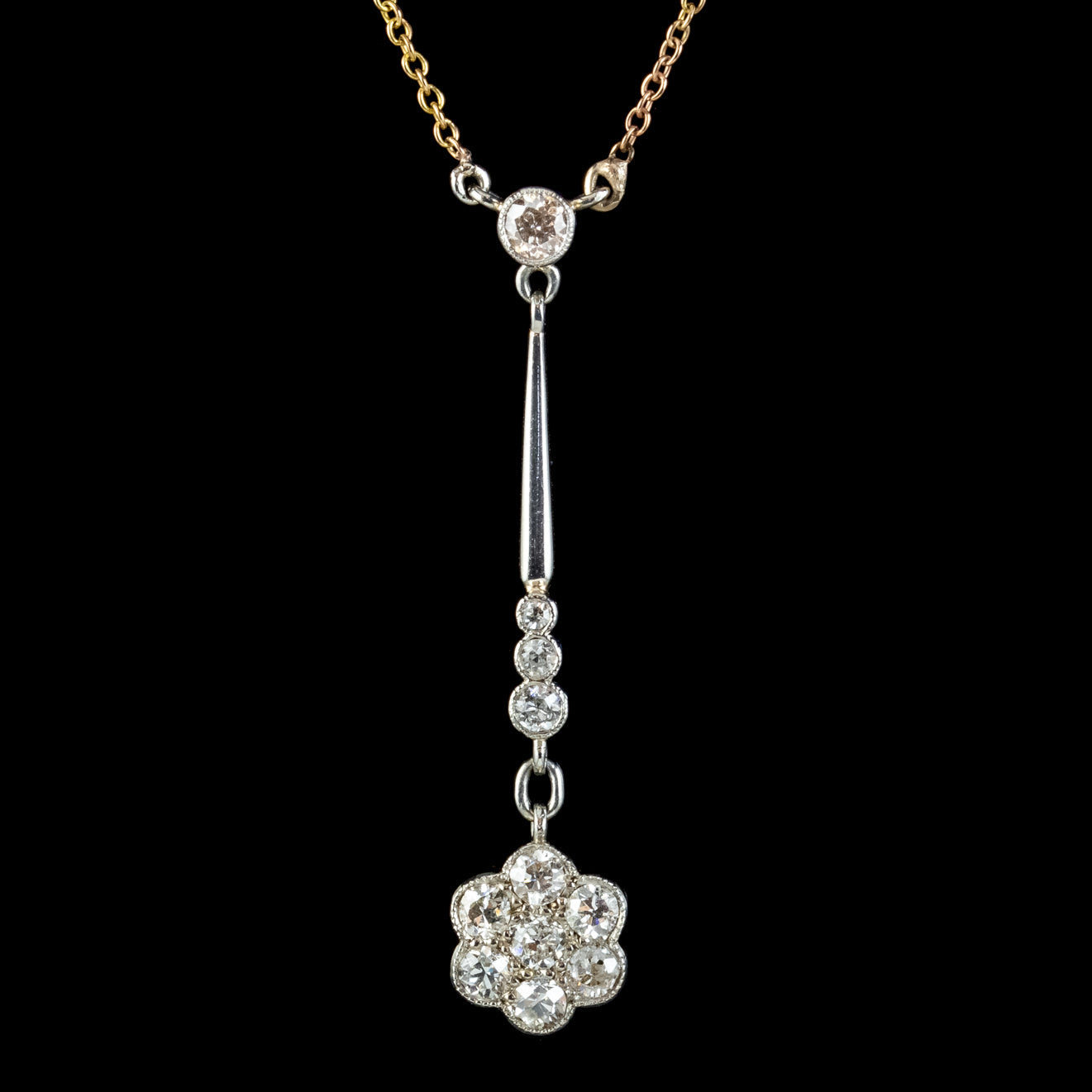 A beautiful lavaliere necklace featuring a lovely long Antique Edwardian drop pendant lined with sparkling Old European cut Diamonds with a dazzling flower shaped cluster at the bottom in milgrain settings (approx. 0.60ct total). ???