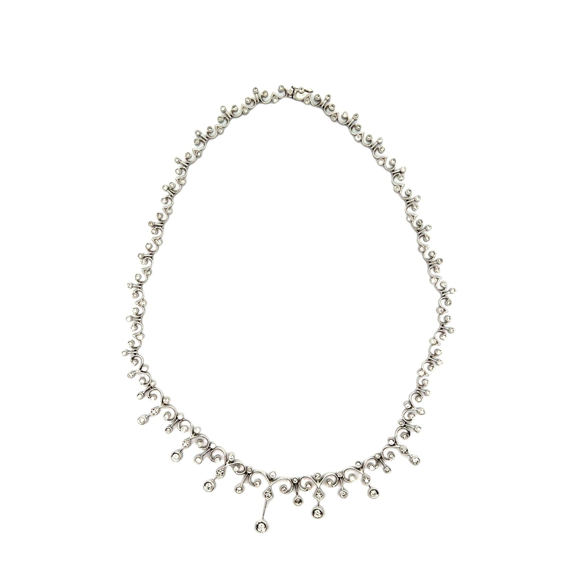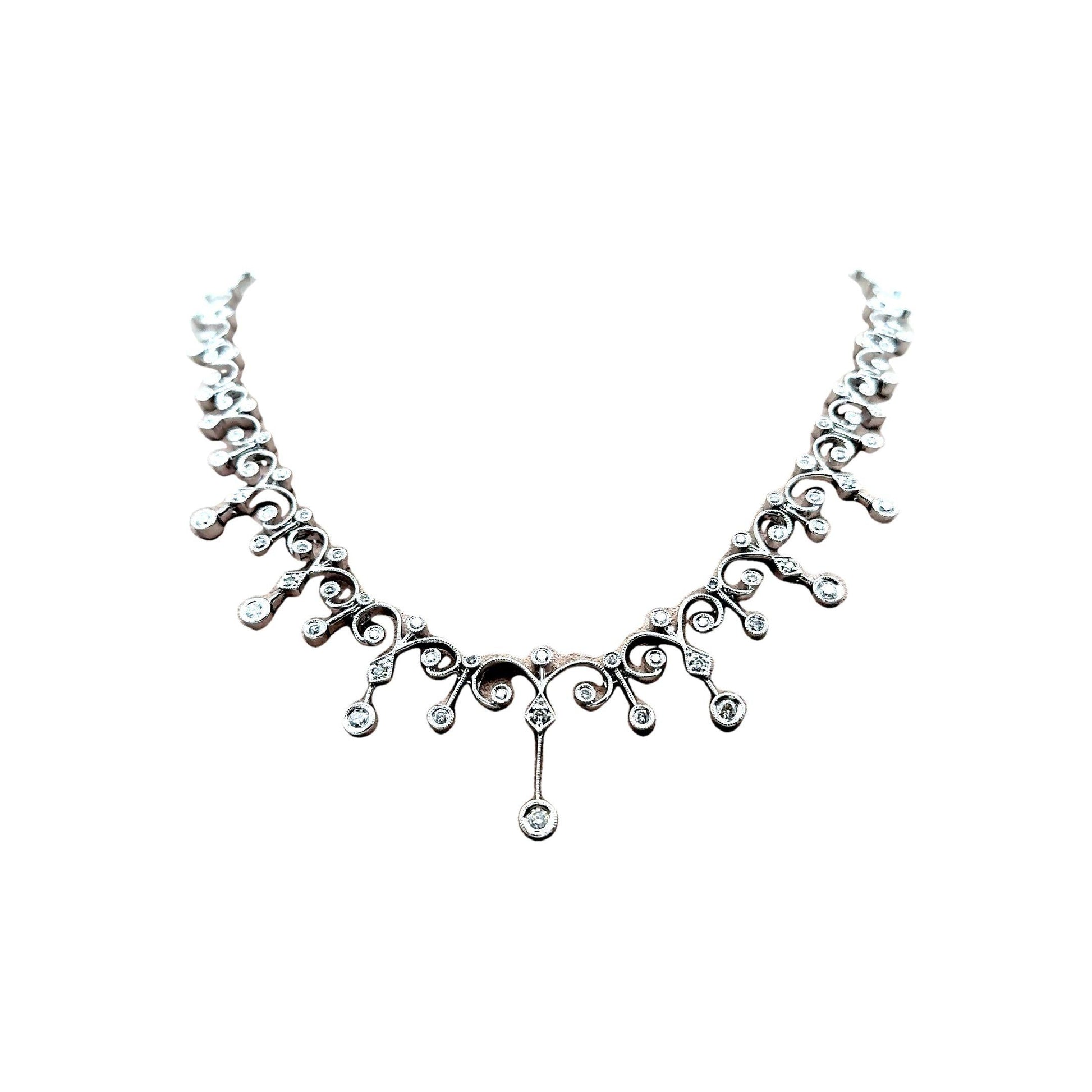This exquisite antique inspired necklace shows a series of round-cut white diamonds totaling 3.16 carats. Crafted in 18k white gold, the necklace features an intricate design with delicate scrollwork, popular in the late 19th?century, each adorned with a sparkling diamond. The arrangement creates a harmonious flow, adding a touch of elegance and sophistication. The craftsmanship is impeccable, reflecting a classical aesthetic. This piece is a testament to refined artistry and modern luxury.