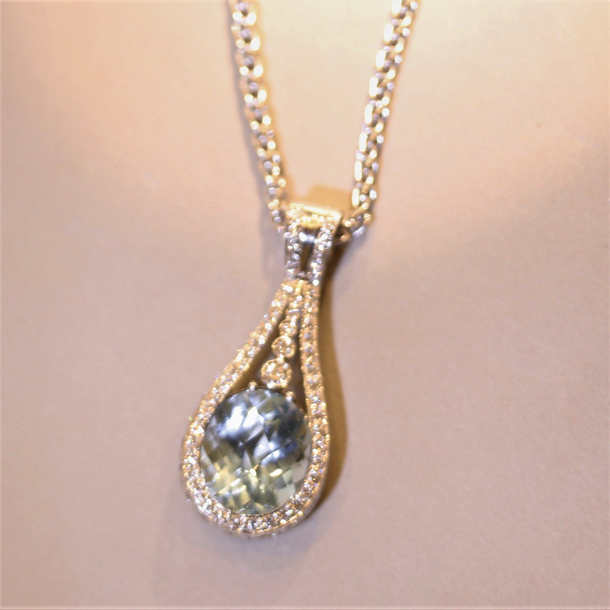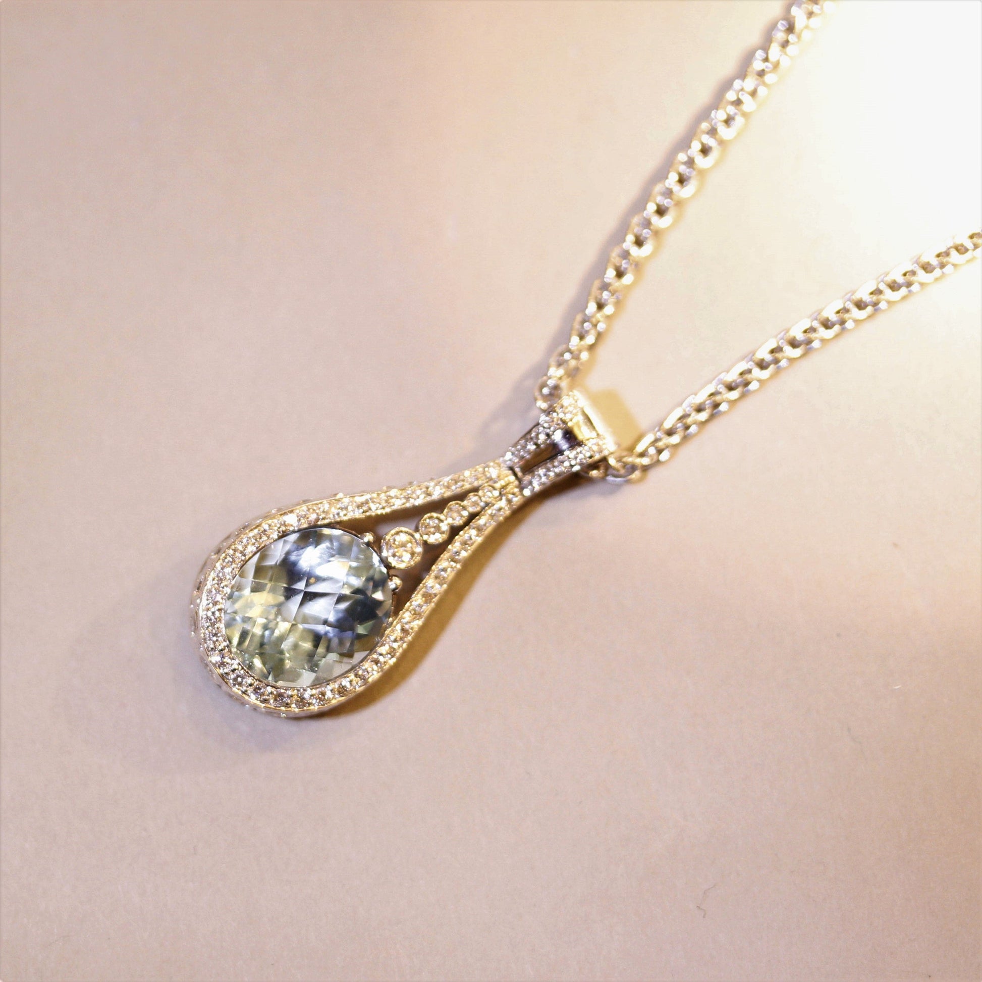 A sleek and sexy pendant featuring a 7.40 carat aquamarine with a unique rose-cut. It has a classic sea-blue color and is accented by 1.06 carats of fine round brilliant cut diamonds which are set across the pendant in a stylish pattern. Made in 18k white gold and comes with a braided gold chain, this lovely piece is ready to be worn!