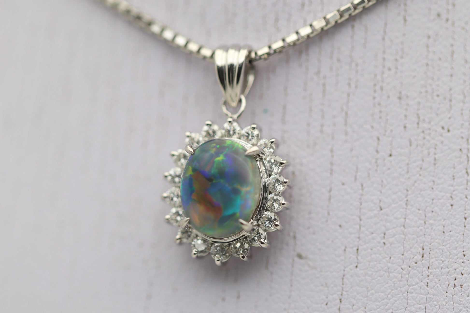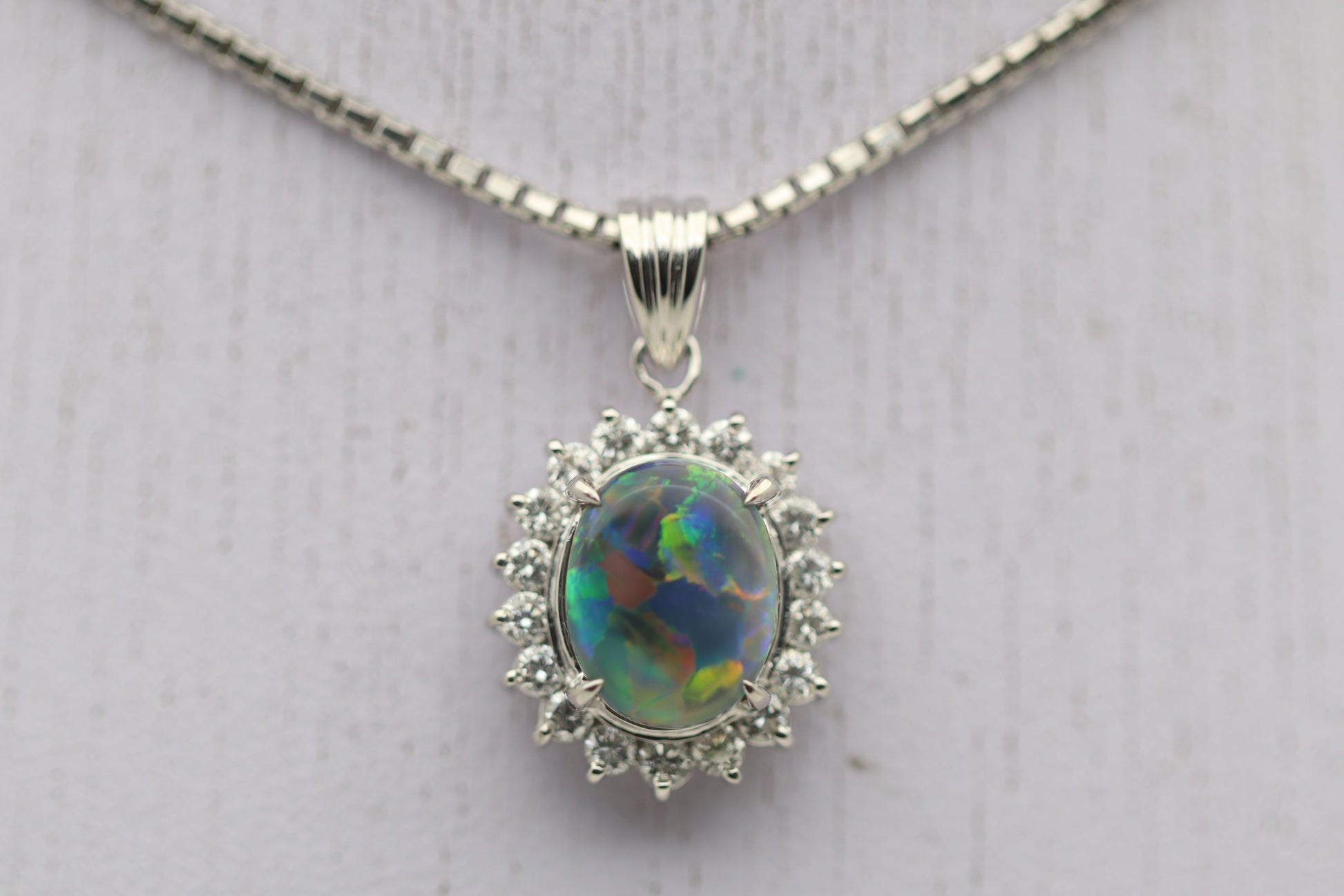 A classic and gemmy Australian black opal weighing 2.85 carats takes center stage of this platinum pendant. It has amazing play-of-color as bright intense flashes of red, orange, yellow, green and blue dance across the stone. It is surrounded by a halo of round brilliant-cut diamonds weighing 0.70 carats which add great sparkle and brilliance to the pendant. Hand-fabricated in platinum, comes with a fine platinum chain and is ready to be worn.