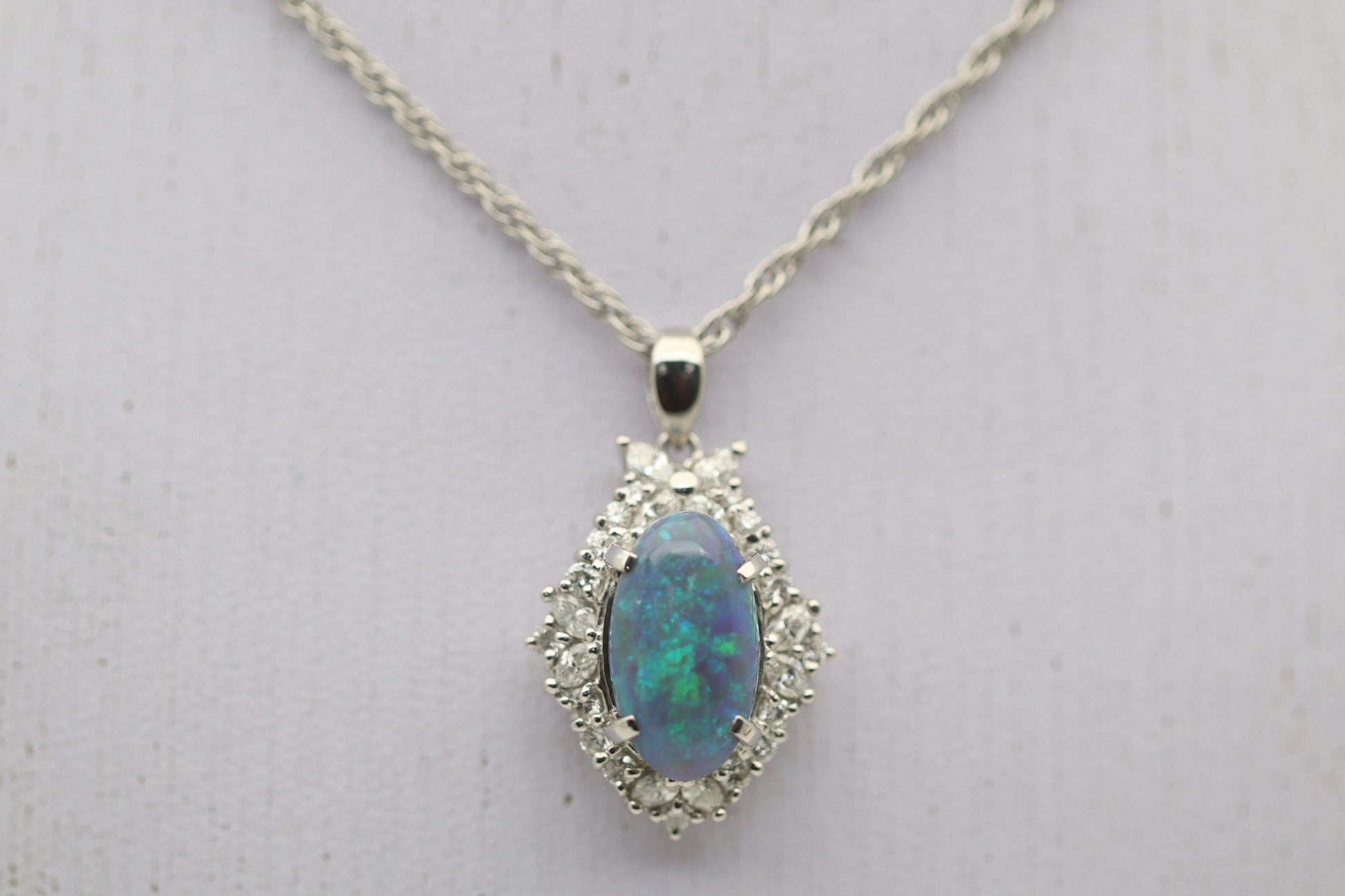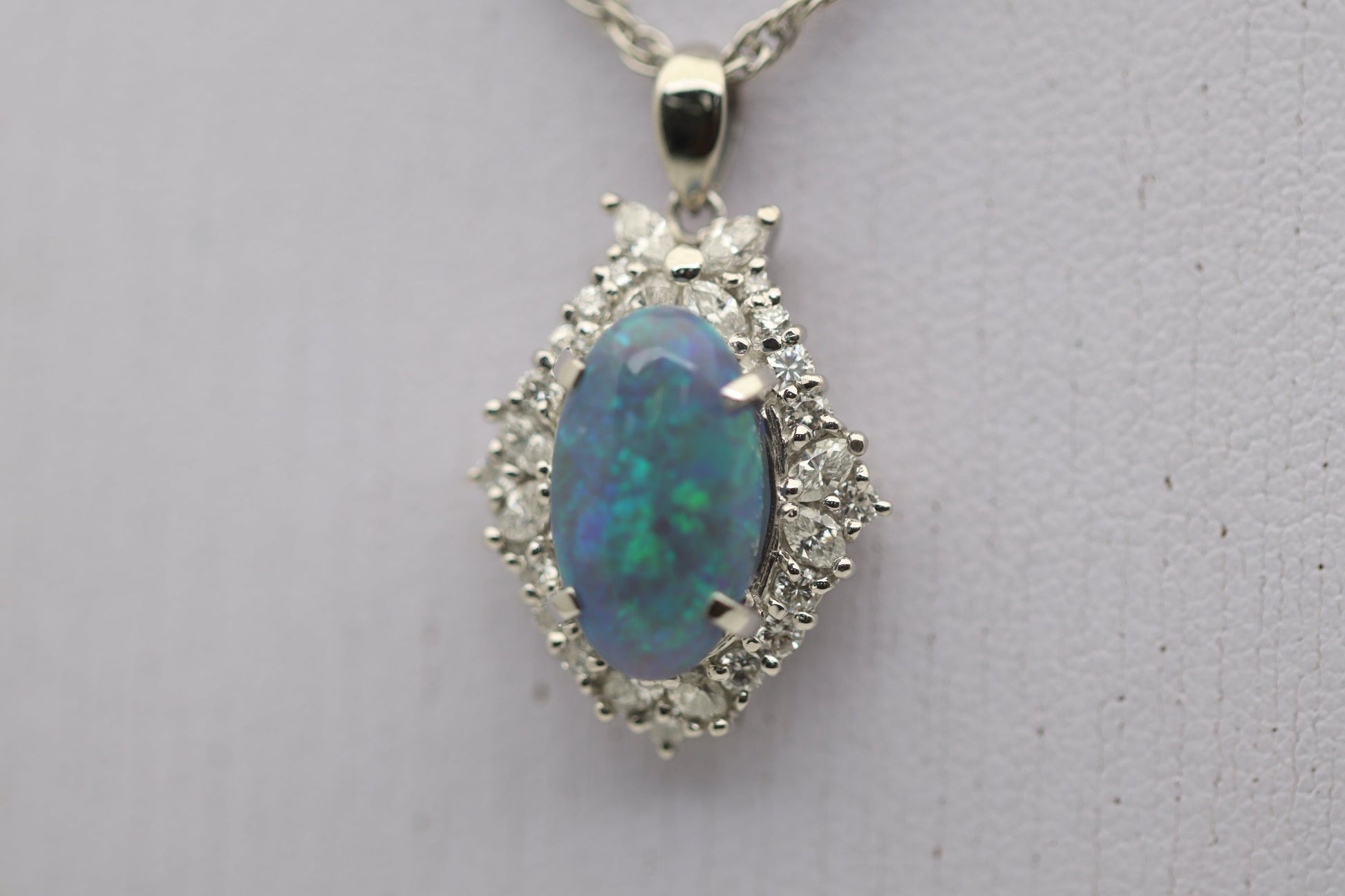 A lovely platinum pendant featuring a natural Australian opal! It weighs approximately 4 carats and has great play-of-color as flashes of greens and blues can be seen across the stone. It is complemented by 0.78 carats of marquise and round brilliant-cut diamonds which add brilliance and sparkle to the piece. Hand-fabricated in platinum and ready to be worn!