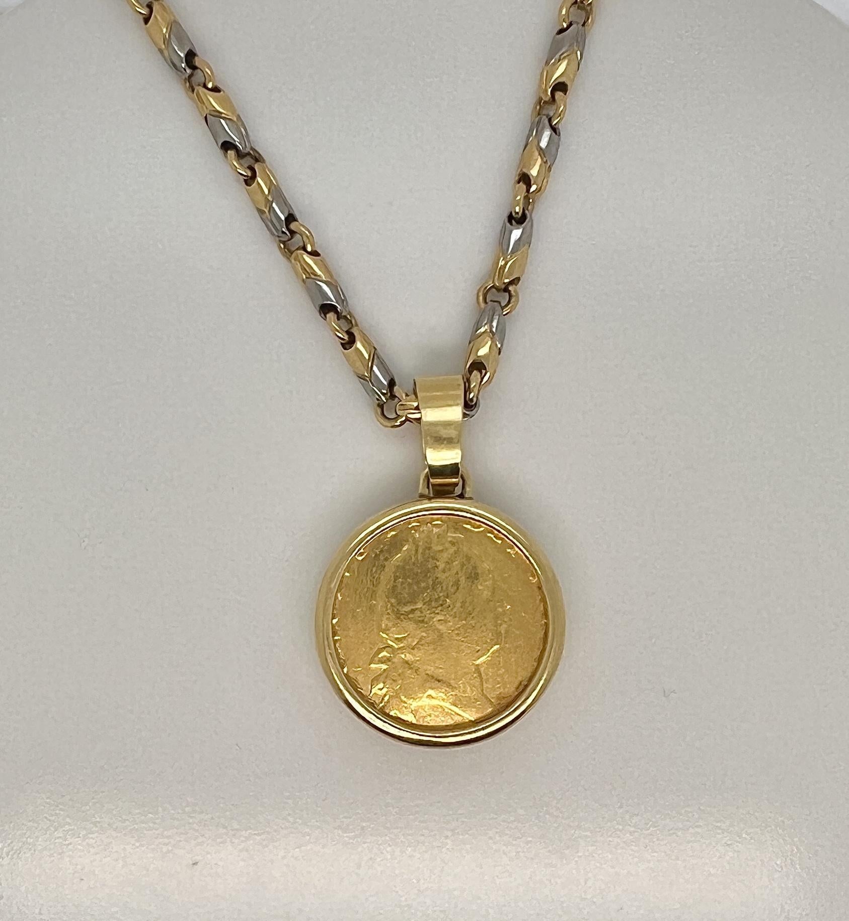 18k solid gold coin, coin is not signed, only necklace chain is signed with: Gold and Steel, Bvlgari. Necklace chain is crafted in gold and steel. Total weight 45.9 grams.