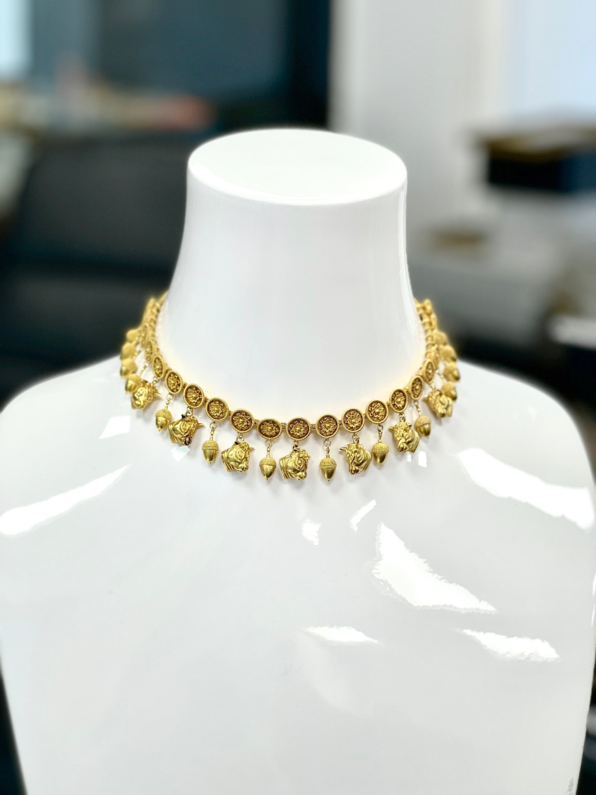 This necklace features sculptural 3 dimensional carved acorns and bull's heads suspended from ornate florette round discs completed on a 2.2 mm wide woven chain. Measures 15.5L and weighs 89.1 grams.