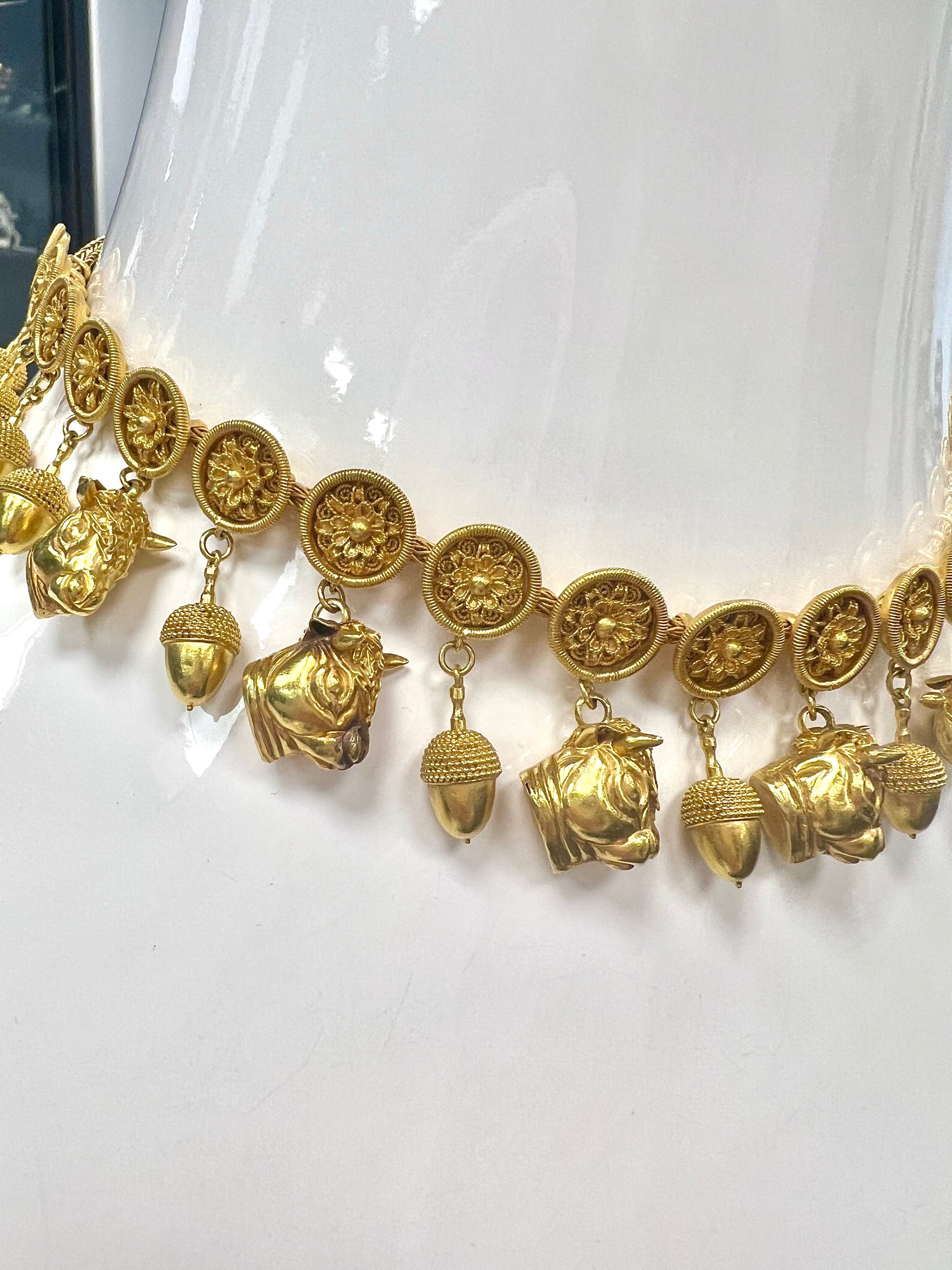 Ilias Lalaounis 22k YG Etruscan Revival Acorn & Bull Necklace.