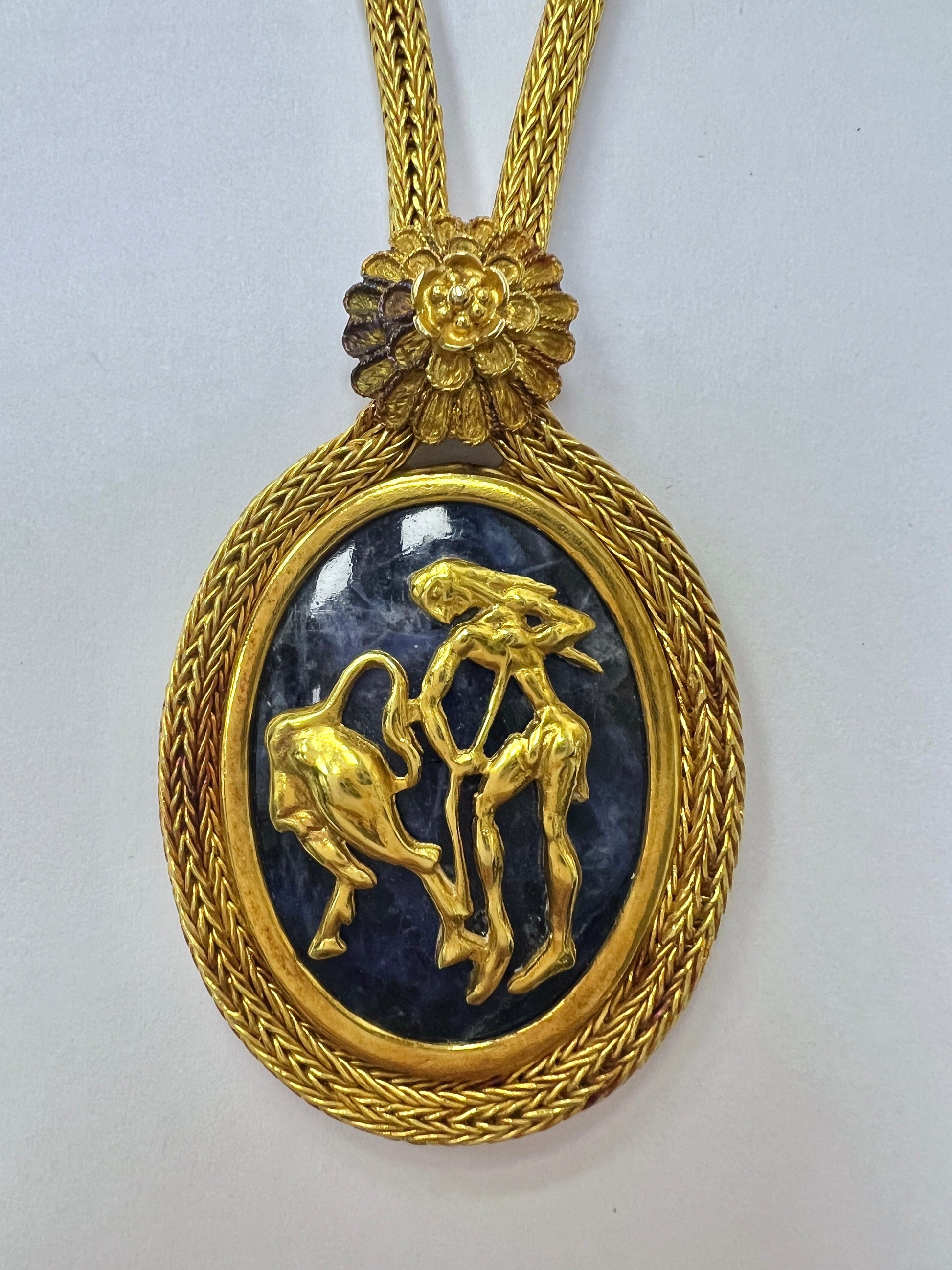 This captivating Greek Revival-style necklace, handcrafted in radiant gold. The focal point is a finely detailed lapis lazuli cameo, featuring a high-relief classical scene in rich gold overlay¡ªdepicting figures inspired by ancient mythology or art.
