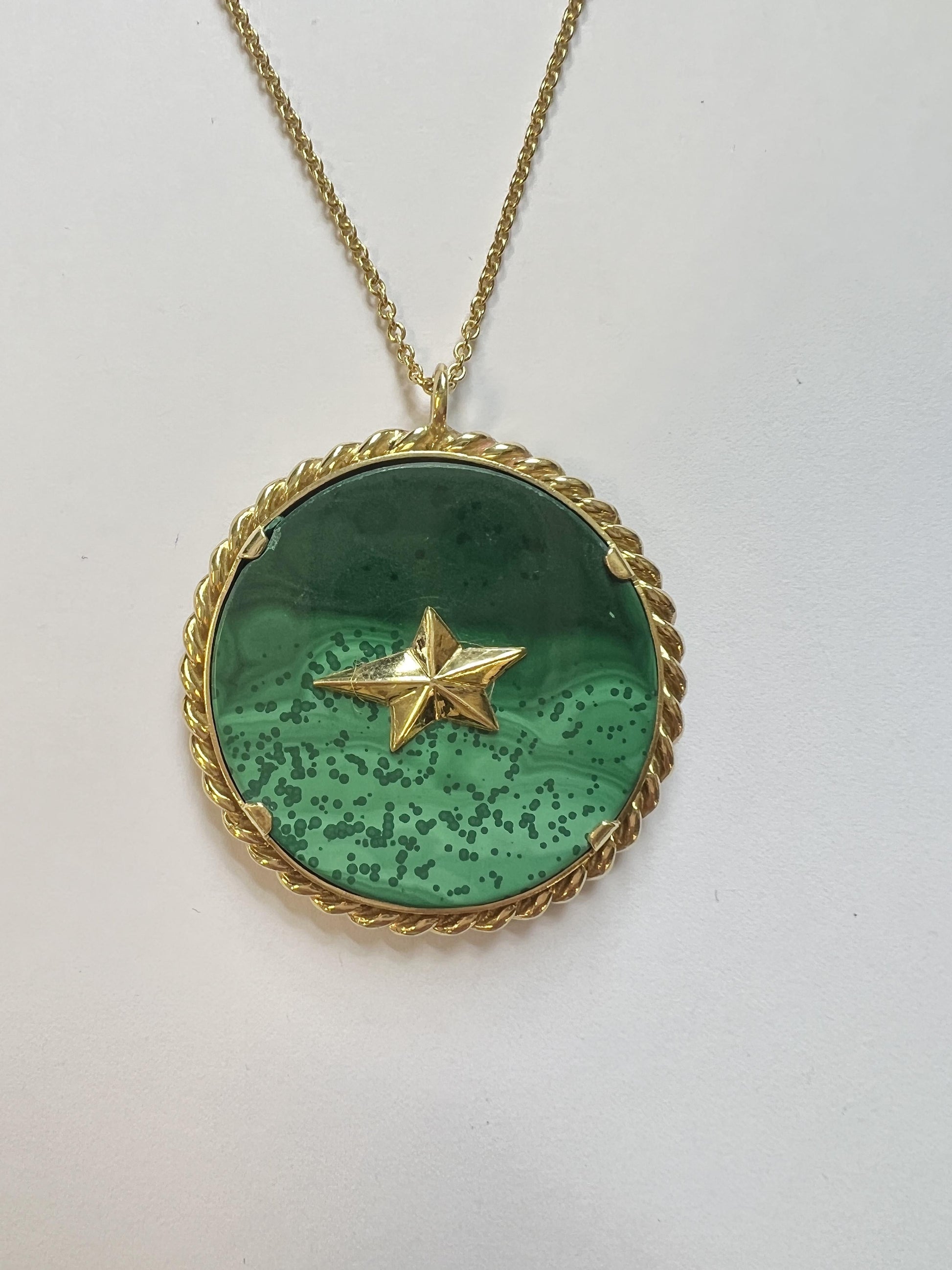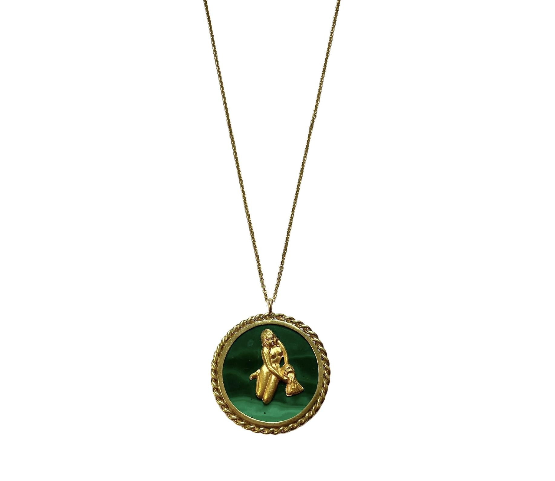 Vintage, circa 1970s, Italian made 18k gold medallion pendant, depicting Aquarius Zodiac sign. Set with malachite. Pendant is 40mm in diameter x 65mm long with bale.