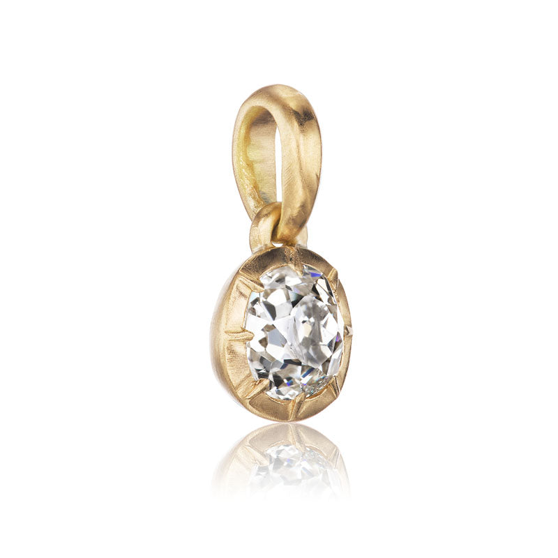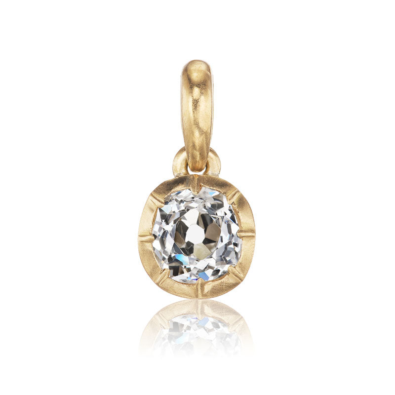 The Lulu Pendant?1.20 is VB original made right here in NYC. The pendant features a GIA Certified?1.20-carat Old Mine Cut diamond of?M color, I2 clarity. The diamond is collet-set in an 18kt yellow gold setting with an 18kt gold bail to slide on any chain you desire.