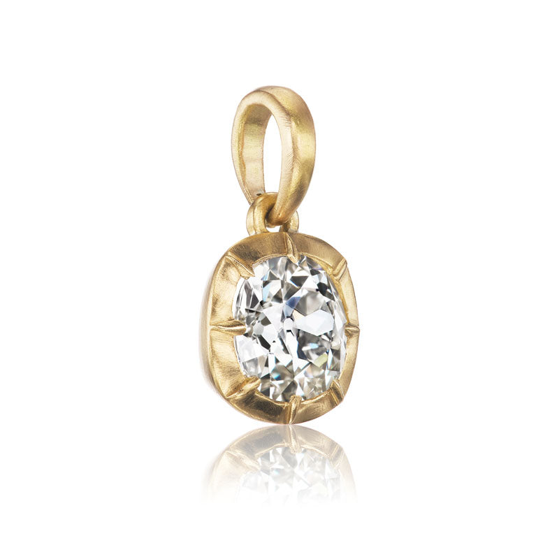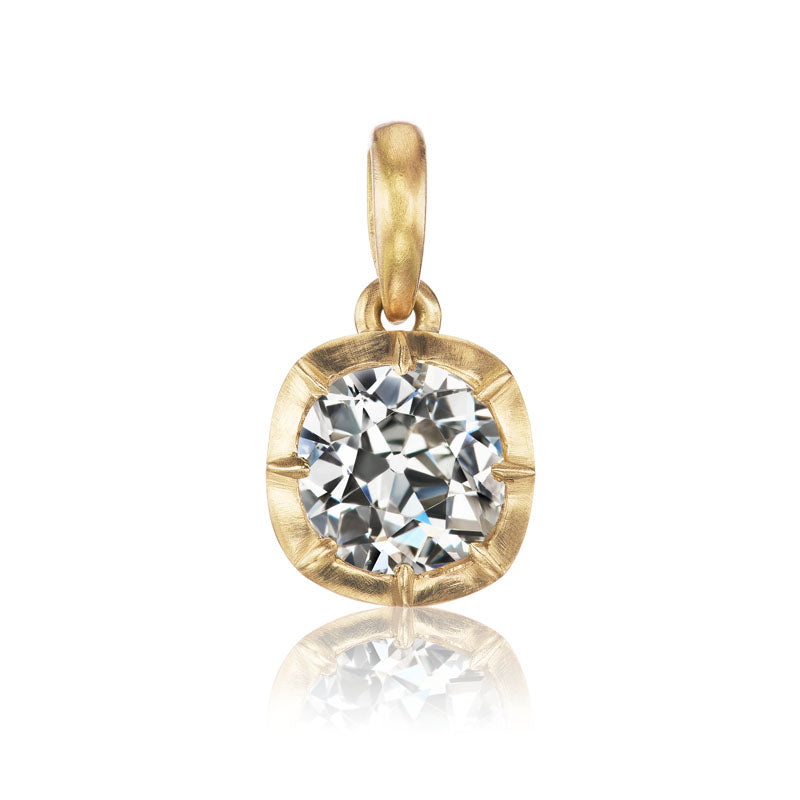 The Lulu Pendant?2.30 is an AB original made right here in NYC. The pendant features a GIA Certified?2.30-carat Old Mine Cut diamond of M color, SI2 clarity. The diamond is collet-set in an 18kt yellow gold setting with an 18kt gold bail to slide on any chain you desire.