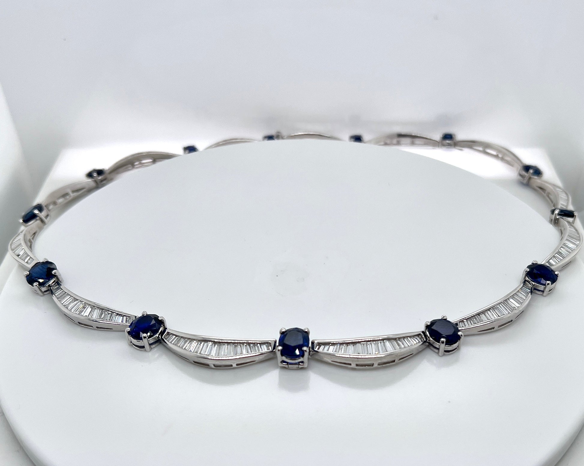 This breathtaking necklace, featuring a dazzling blue sapphires and shimmering baguette-cut diamonds, offering brilliance from every angle.